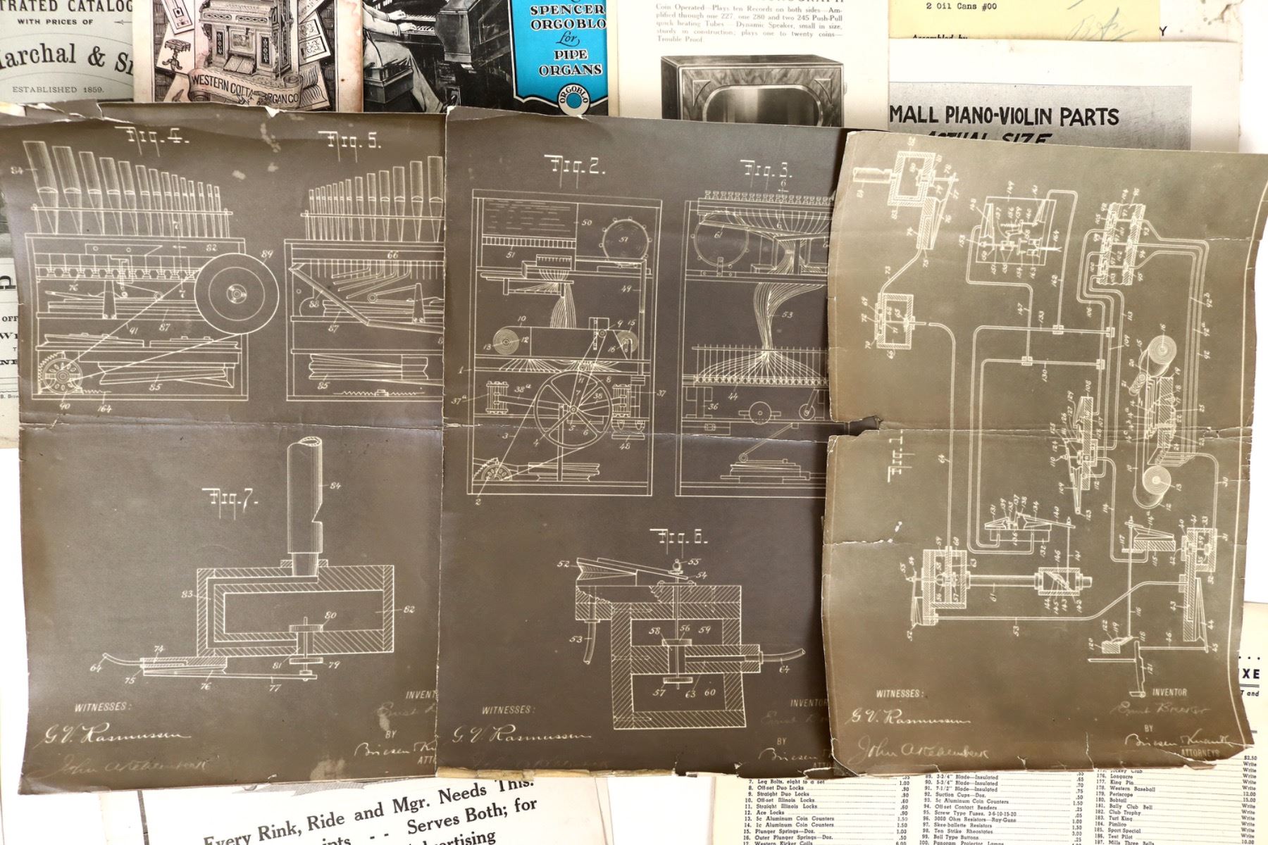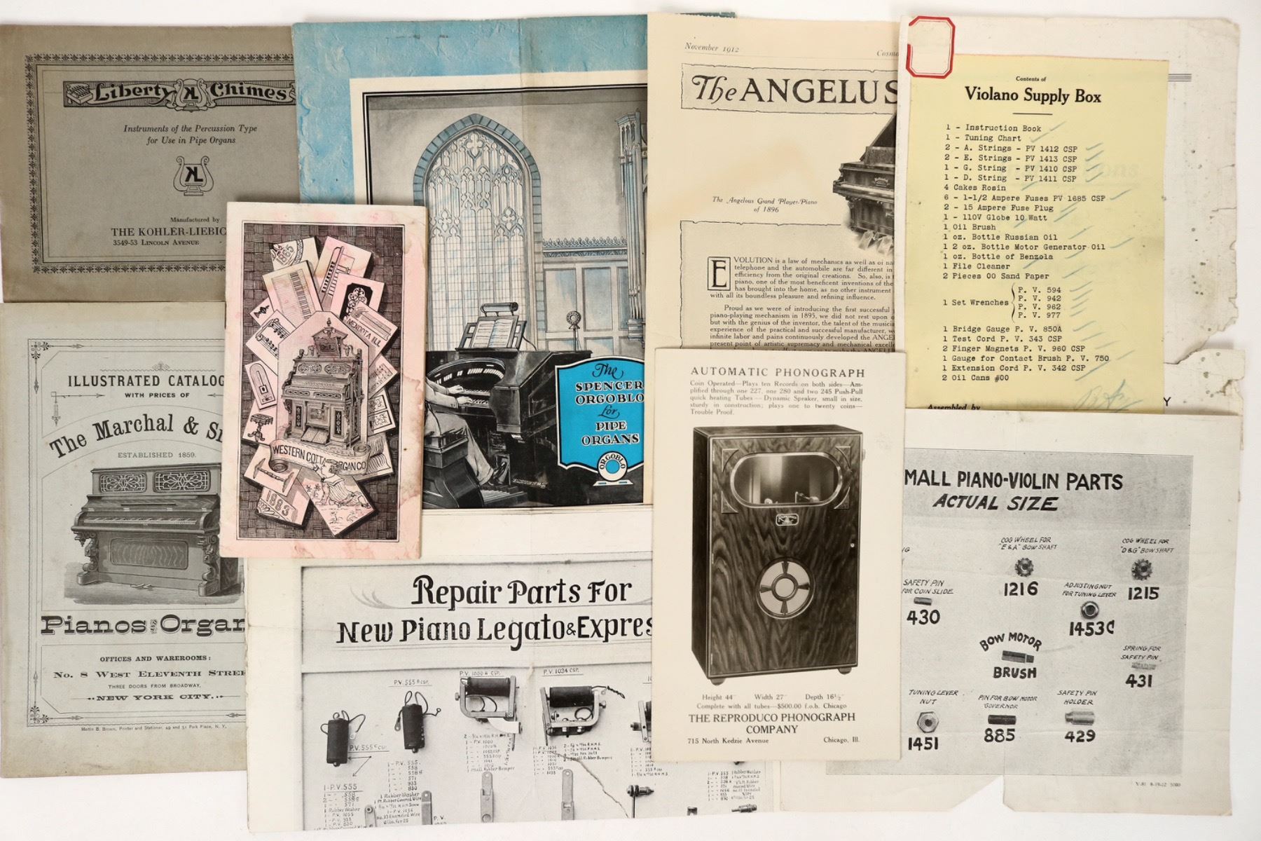 19 pieces of coin operated piano, organ and music machine ephemera. Liberty Chimes, Orgoblo, Marchal and Smith, Angelus, parts diagrams, schematic drawings, Operator's Piano etc. See photo.