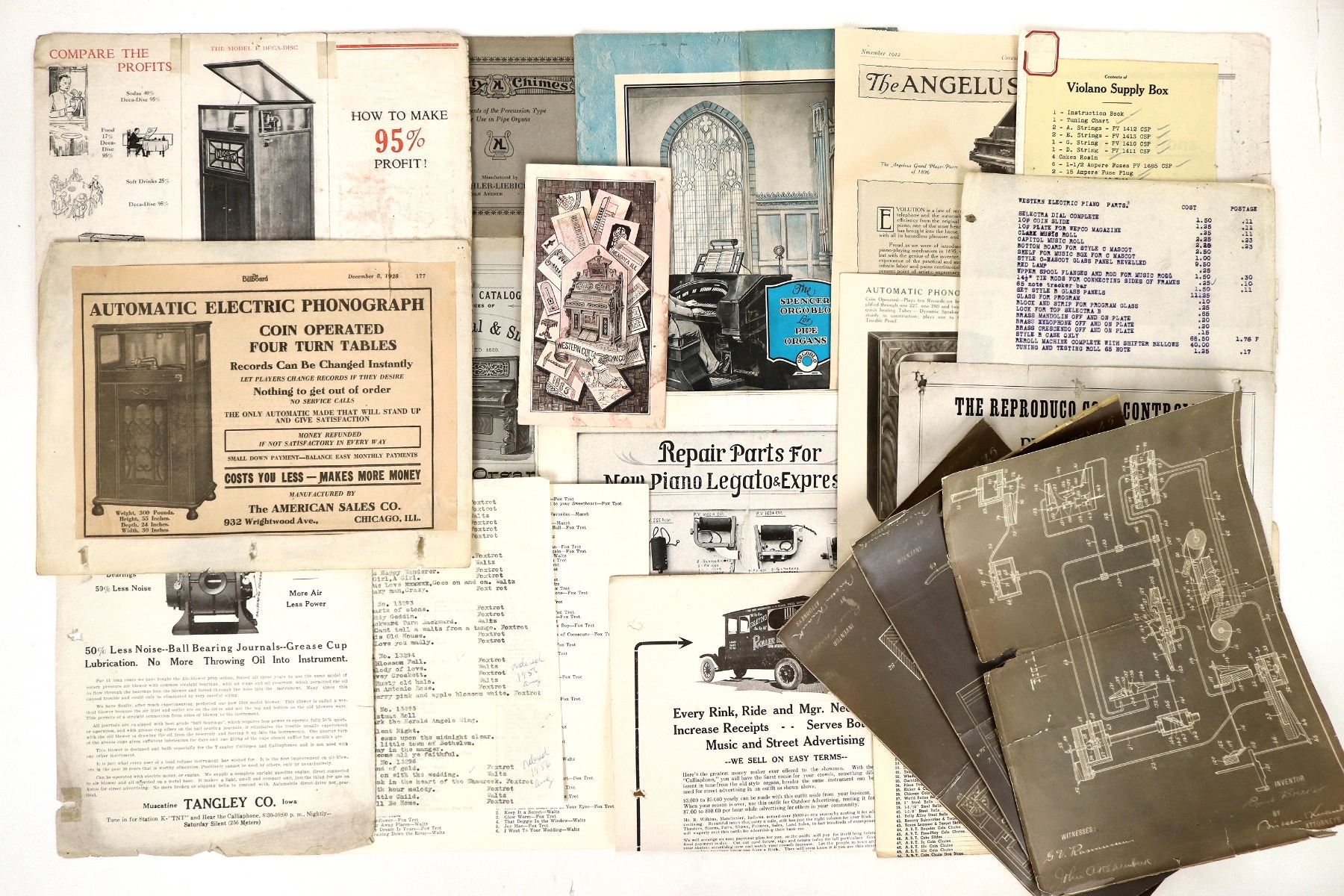 19 pieces of coin operated piano, organ and music machine ephemera. Liberty Chimes, Orgoblo, Marchal and Smith, Angelus, parts diagrams, schematic drawings, Operator's Piano etc. See photo.
