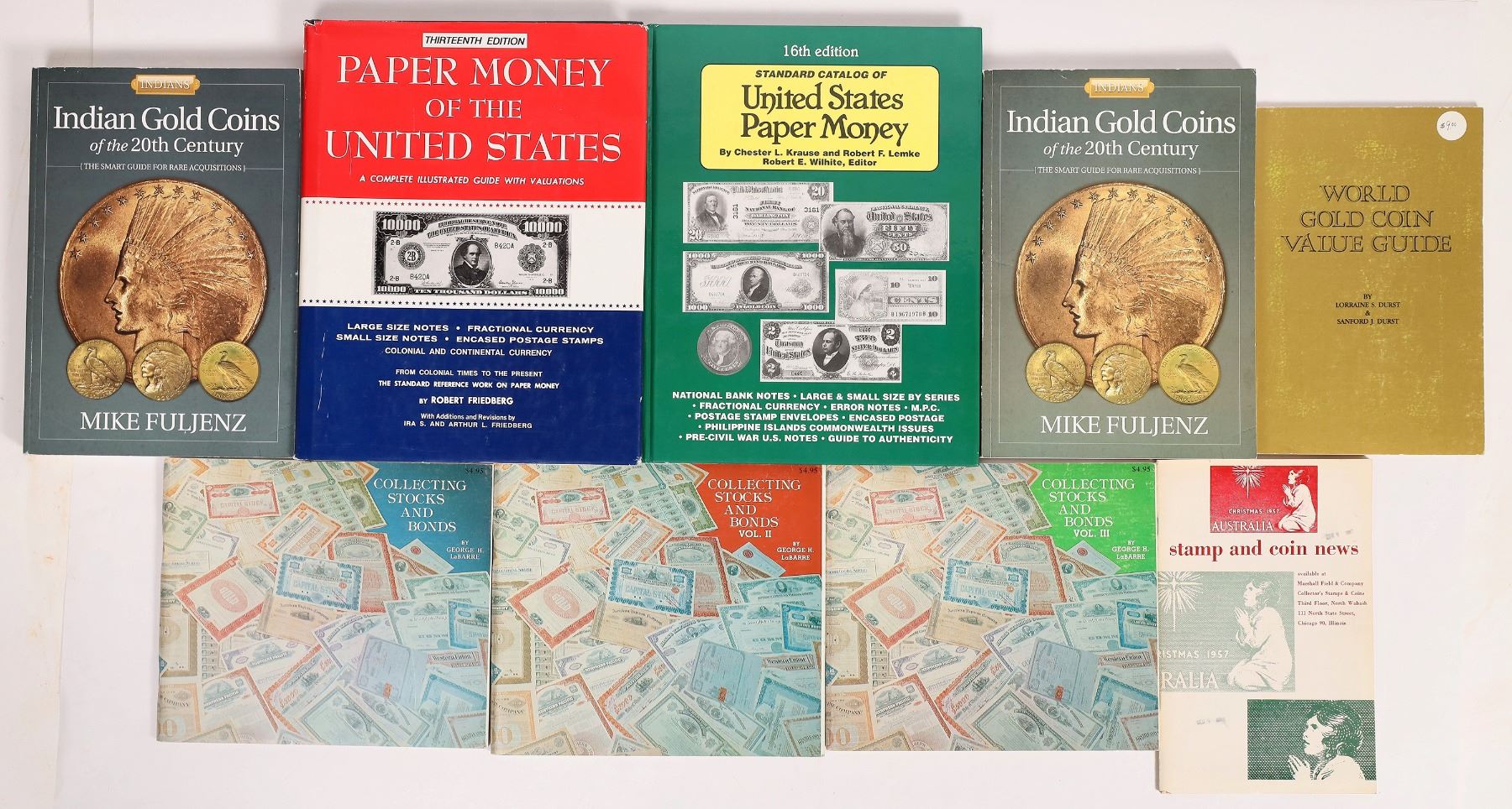Group of eight different reference books for coin and currency collectors. Titles include World Gold Coin Value Guide by Lorraine S. and Sanford J. Durst, Indian Gold Goins of the 20th Century by Mike Fuljenz (2 copies), Collecting Stocks and Bonds Volumes I, II, and III by George H. LaBarre, Stamp and Coin News, Paper Money of the United States by Robert Friedberg, and Standard Catalog of United States Paper Money by Chester L. Krause and Robert F. Lemke. Good condition.
