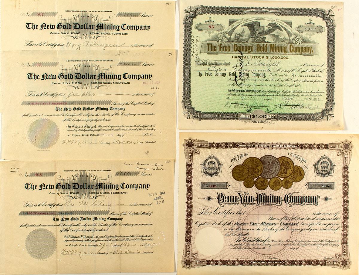 Lot of five gold mining stocks with coin related names. 1) The Free Coinage Gold Mining Company. Cripple Creek, CO. Issued 1892. Pen cancelled. Gilt title and eagle vignette. Pin holes. 2) The New Gold Dollar Mining Company. Inc. in Colorado. Three stocks issued 1919-1923. Punch cancelled. Folds and staple holes. 3) Penn Yan Mining Company. Inc. in Montana. Not issued. Gorgeous certificate with gilt illustrations of nine coins. Clean. (Prag Collection) City: State: Colorado & Montana Date: 1892-1923 ID# 34460