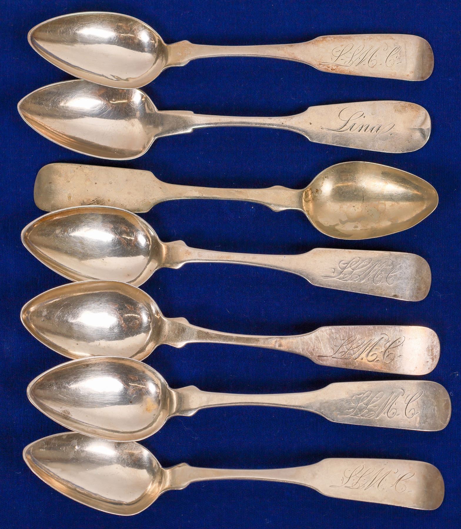 Five teaspoons in what we think is coin silver (90% Ag) stamped P.P. HAVES / POKEEPSIE on the back of the handle, ~6 inches long, 0.46 Tr oz each. Engraved HMC on the handles. Two other teaspoons, different hallmarks, unidentified maker and pattern, 0.58 Tr oz each. Seven spoons, total weight 3.8 Tr oz, Ag weight 3.42 Tr oz. See photo for design details.