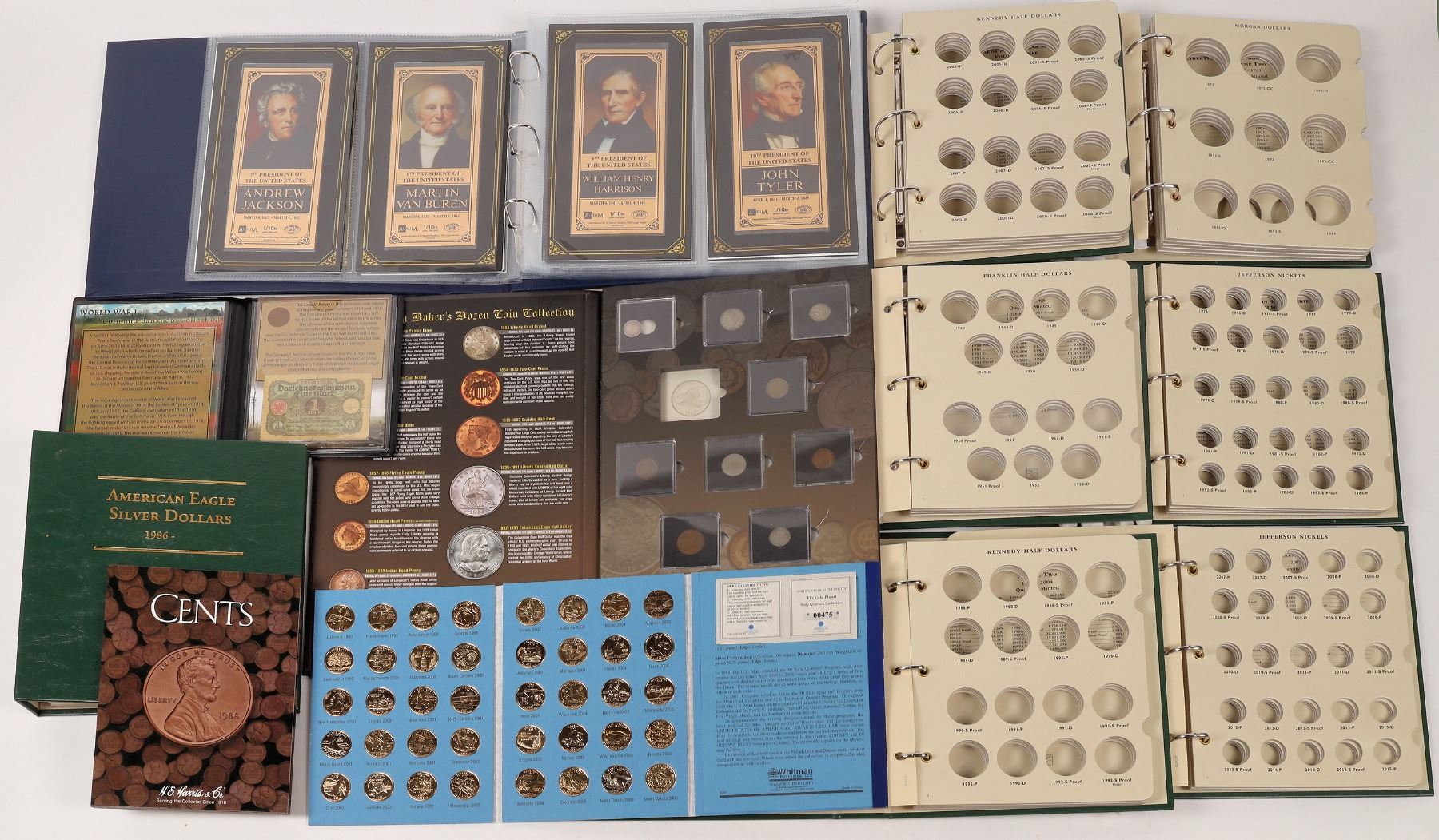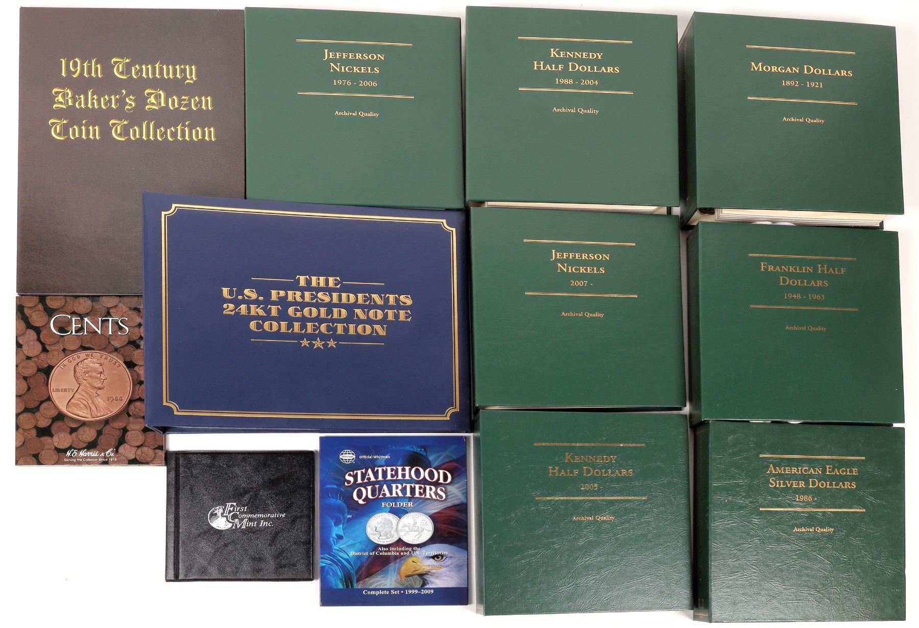 Miscellaneous dealer lot of coin albums and collections. Seven brand new, unused Littleton Custom Coin Albums (no coins included): Morgan Dollars 1892-1921; Jefferson Nickels 1976-2006; Jefferson Nickels 2007-; Kennedy Half Dollars 1988-2004; Kennedy Half Dollars 2005-; Franklin Half Dollars 1948-1963, American Eagle Silver Dollars 1986-. Brand new H. E. Harris & Co. album 2676 Cents, Plain (no coins included). Whitman Publishing album 8097 Statehood Quarters folder, complete with 56 brilliant uncirculated state quarters that have been gold plated by the American Mint. First Commemorative Mint: World War I coin and banknote collection: with a 1914 Lincoln penny and a one mark German banknote, with historical background information. 19th Century Baker's Dozen Coin Collection, with nine coins and three empty spaces. Coins included are: 1855 Liberty Seated dime; 1883 Liberty Head nickel; 1862 Indian Head penny; 1891 Indian Head penny; 1863 Army & Navy Civil War token; 1863 Shield Nickel; 1865 three cent nickel; 1866 two cent piece; 1853 w/arrows Seated Liberty quarter; 1921 Morgan dollar. The U. S. Presidents 24kt gold note collection, issued by Willabee & Ward of the Danbury Mint. 5 x 9 inch presidential portraits trimmed in gold. Nineteen presidents are included. (these sell for $69.95 online).