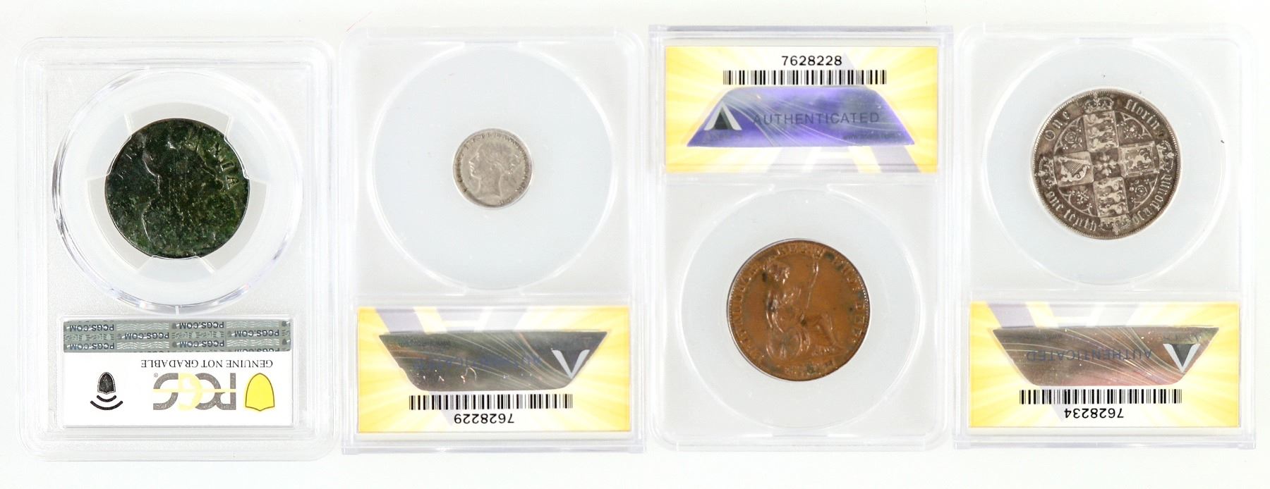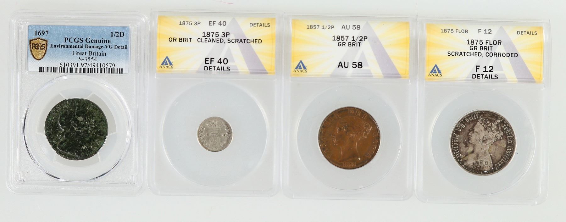 Four British coins authenticated by ANACS & PCGS: 1) 1857 half pence; AU 58. 2) 1875 three pence; EF 40 Details, cleaned, scratched. 3) 1875 florin; F 12 Details, scratched, corroded. 4) 1697 half penny; PCGS Genuine, VG Detail, environmental damage; S-3554