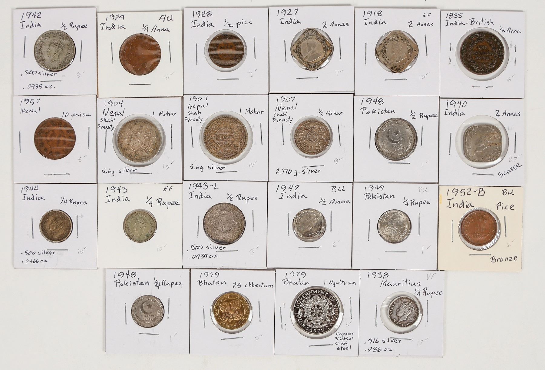 Four countries south of the Himalayas: Bhutan: 1979 1 Ngultrum; 1979 25 chhertum. Pakistan: 1948 1/4 rupee; 1948 1/2 rupee; 1949 1/2 rupee. Nepal: 1904 1 mohar (2); 1907 1/2 mohar; 1957 10 paisa. India (12): 1835 1/4 anna; 1918 2 annas; 1927 2 annas; 1928 1/2 pice; 1929 1/4 anna; 1940 2 annas; 1942 1/2 rupee; 1943 1/4 rupee; 1943 1/2 rupee; 1944 1/4 rupee; 1947 1/2 anna; 1952 pice. Mauritius 1938 1/2 rupee.