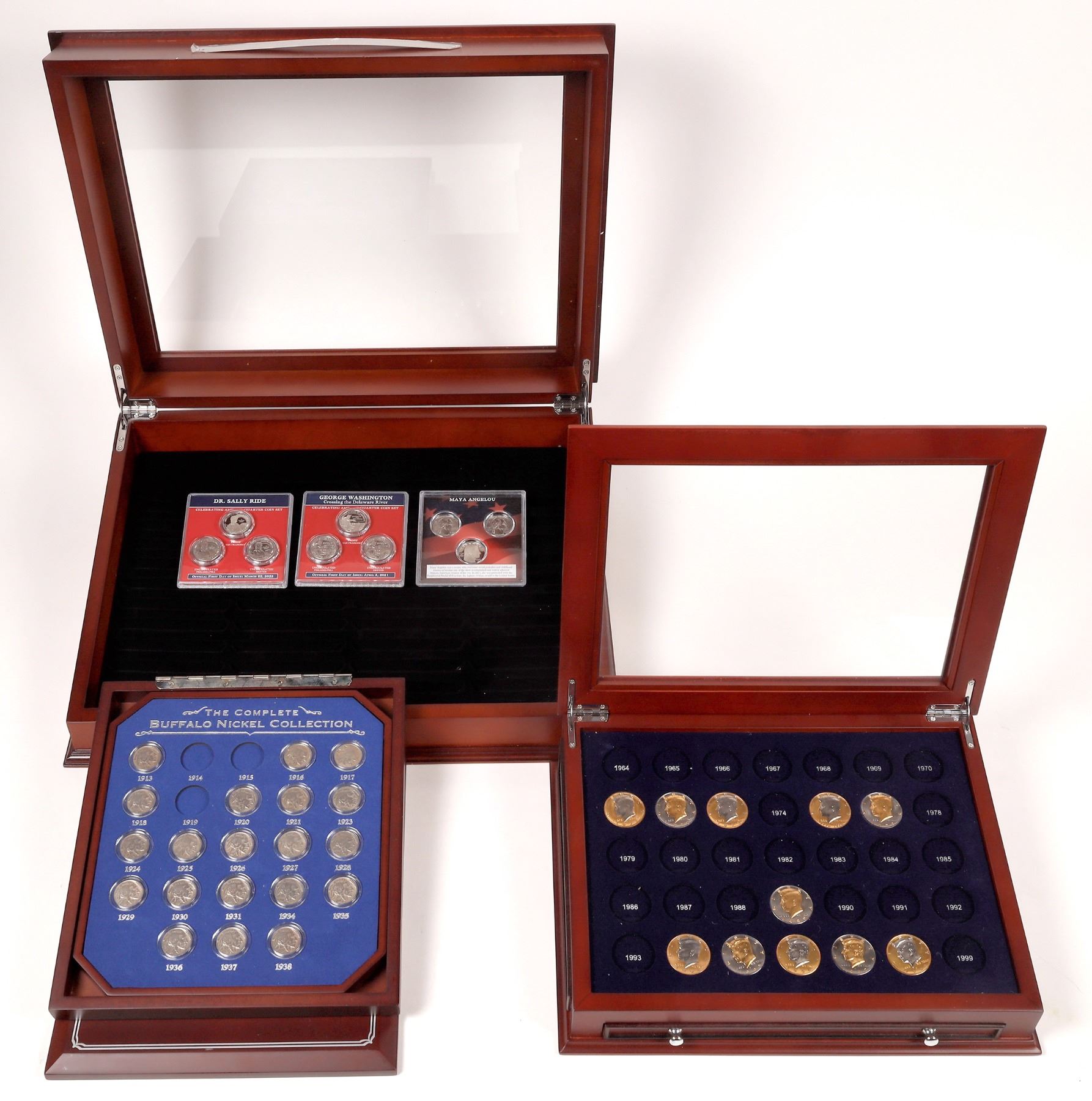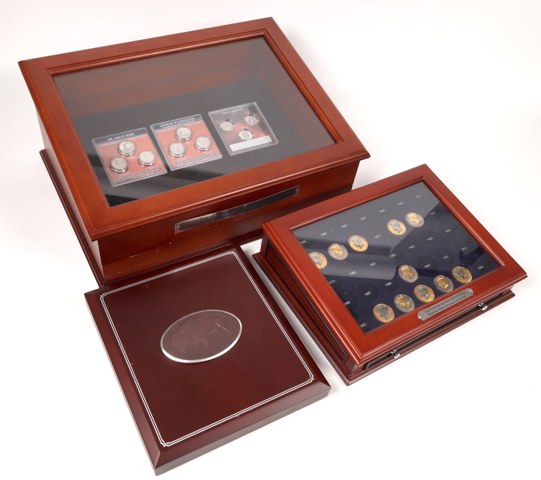 Three coin presentations in wooden cases. 1) Buffalo Nickel Collection issued by Danbury Mint. An embossed buffalo stands on the cover of the 9 x 11 inch box, and inside are 20 Buffalo nickels, with three empty spaces for 1915, 1919 and 1938. (the hinged top is separated). 2) Platinum and gold highlighted Kennedy Half Dollar Collection, issued by PCS Stamps and Coins. Glass topped wooden case (13 x 10 x 4 inches). Included are 16 Kennedy half dollars enhanced with platinum or gold toning. None of the half dollars are silver. 3) Celebrating America Quarters, issued by PCS Stamps and Coins, a glass topped case (18 x 14 x 7 inches with slots for state and commemorative quarters. Three 3 quarter plastics: Maya Angelou, George Washington and Dr. Sally Ride.