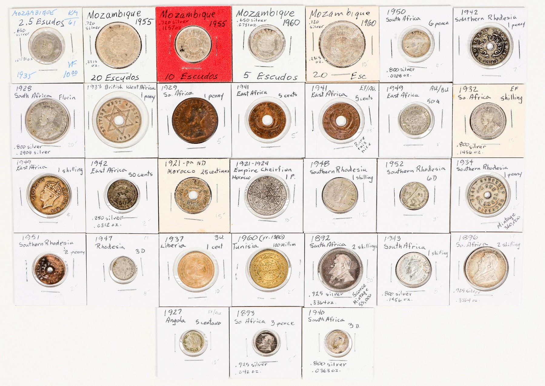 Coins of Africa: Angola 1927 5 centavo; British West Africa 1933 penny; Tunisia 1960 100 millim; Liberia 1937 1 cent(BU); Southern Rhodesia 1937 3 pence; 1951 1/2 penny; 1934 penny; 1942 penny; 1952 6 pence; 1948 1 shilling; Morocco 1921 25c.; 1921 1 franc; East Africa 1941 5c (2); 1942 50c. 1949 1 shilling; 1949 50c.; South Africa: 1892 2 shilling; 1893 3 pence; 1896 2 shilling; 1928 florin; 1929 penny; 1932 shilling; 1940 3 pence; 1943 shilling; 1950 6 pence; Mozambique: 1935 2 1/2 escudos; 1955 20 escudos; 1955 10 escudos; 1960 5 escudos; 1960 20 escudo.