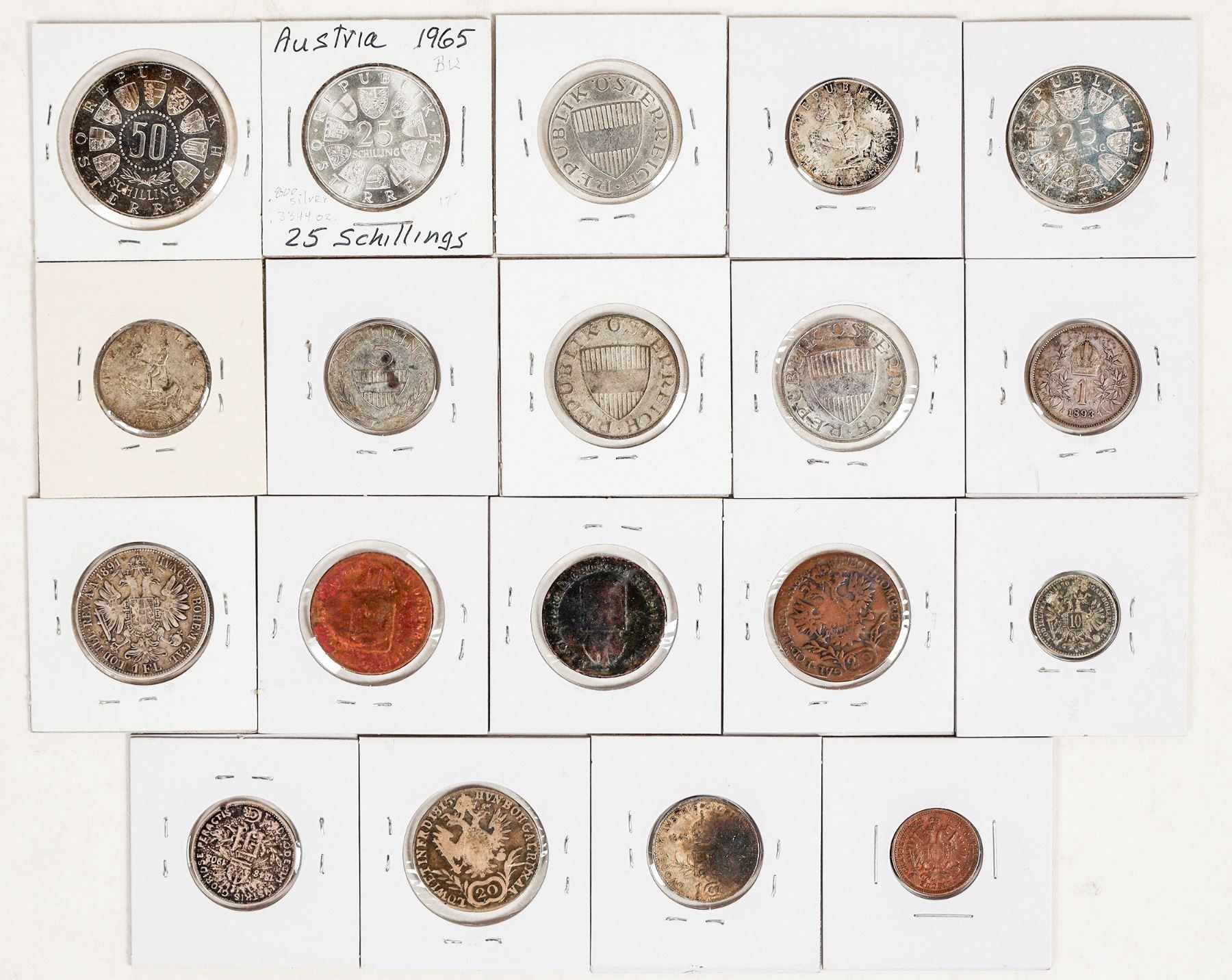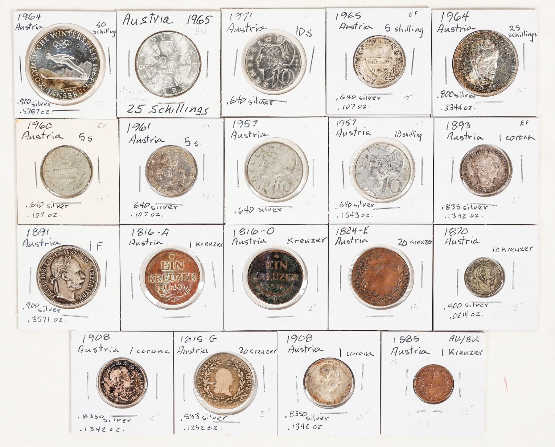 Coins of Austria (1815-1971): 1815-G 20 kreuzer; 1816-A 1 kreuzer; 1816-O 1 kreuzer; 1824-E 20 Kreuzer; 1870 10 kreuzer; 1885 1 kreuzer; 1891 1 florin; 1893 1 corona; 1908 1 corona (2); 1957 10 shilling (2); 1960 5 shilling; 1961 5 shilling; 1965 5 shilling; 1964 25 shilling; 1964 50 shilling; 1965 25 shilling; 1971 10 shilling. Mostly silver coins.
