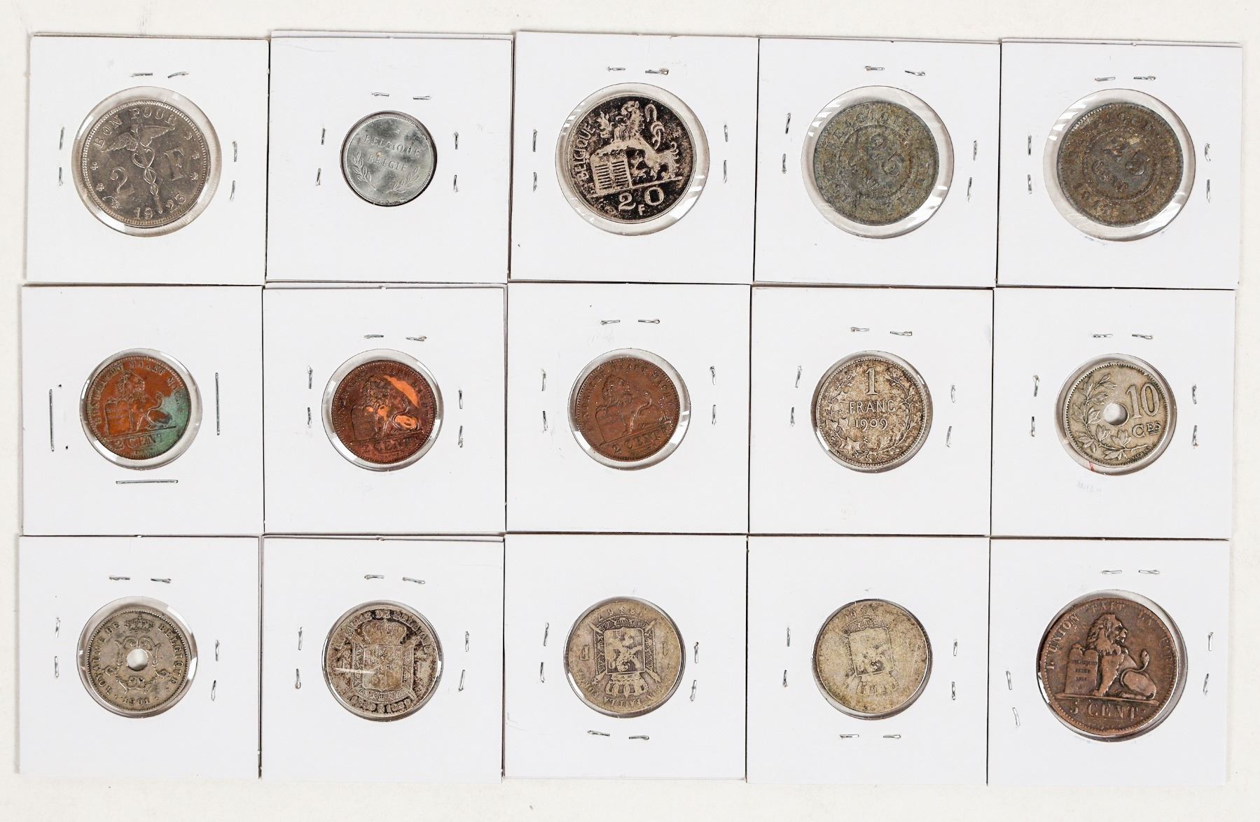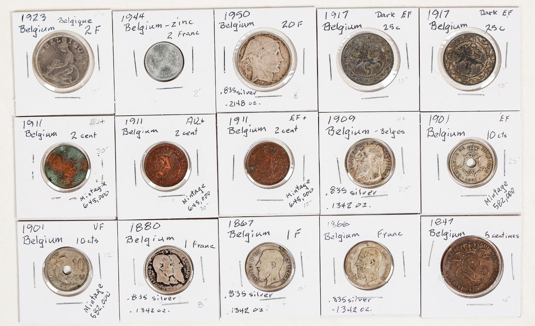 Fifteen coins of Belgium (1847-1950): 1847 5 centimes; 1866 one franc; 1867 one franc; 1880 one franc; 1901 ten cents (2); 1909 one franc; 1911 two cent (3); 1917 25 cent (2); 1923 2 franc; 1944 2 franc; 1950 20 franc.