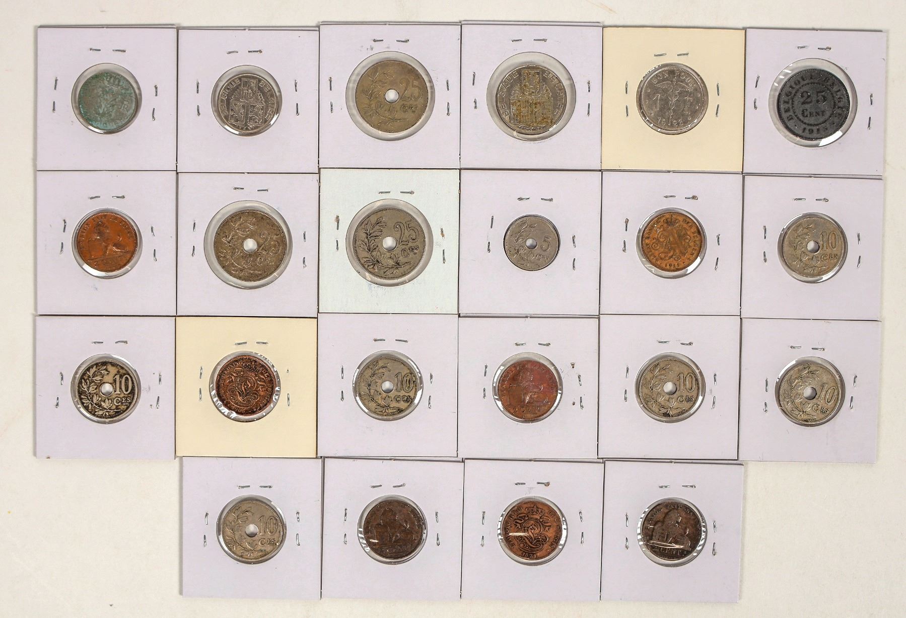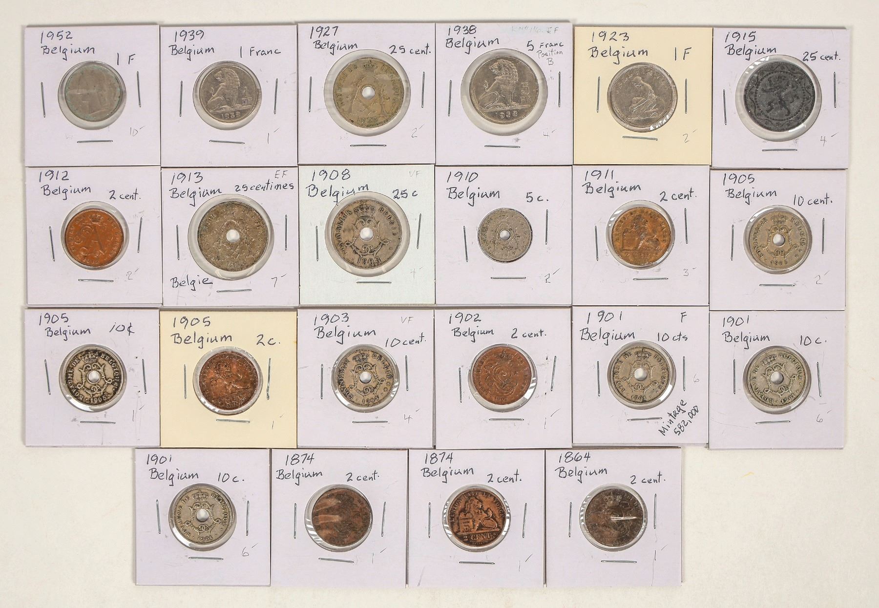 Twenty two coins from Belgium: 1864 2c.; 1874 2c. (2); 1901 10c. (3); 1902 2c.; 1903 10c.; 1905 2c.; 1905 10c. (2); 1908 25c.; 1910 5c.; 1911 2c.; 1912 2c.; 1913 25c.; 1915 25c.; 1923 1 franc; 1927 25c.; 1938 5 franc; 1939 1 franc; 1952 1 franc.