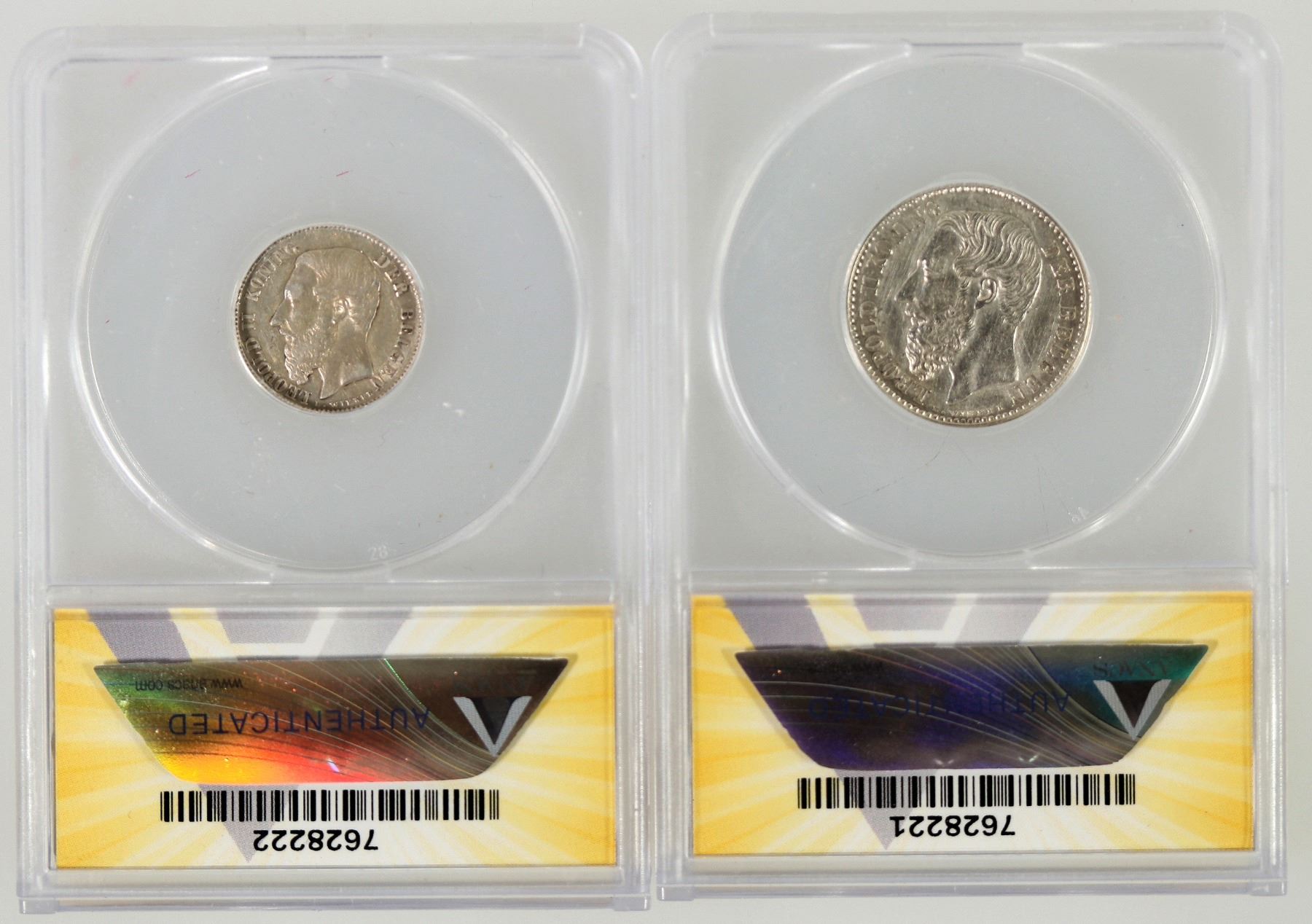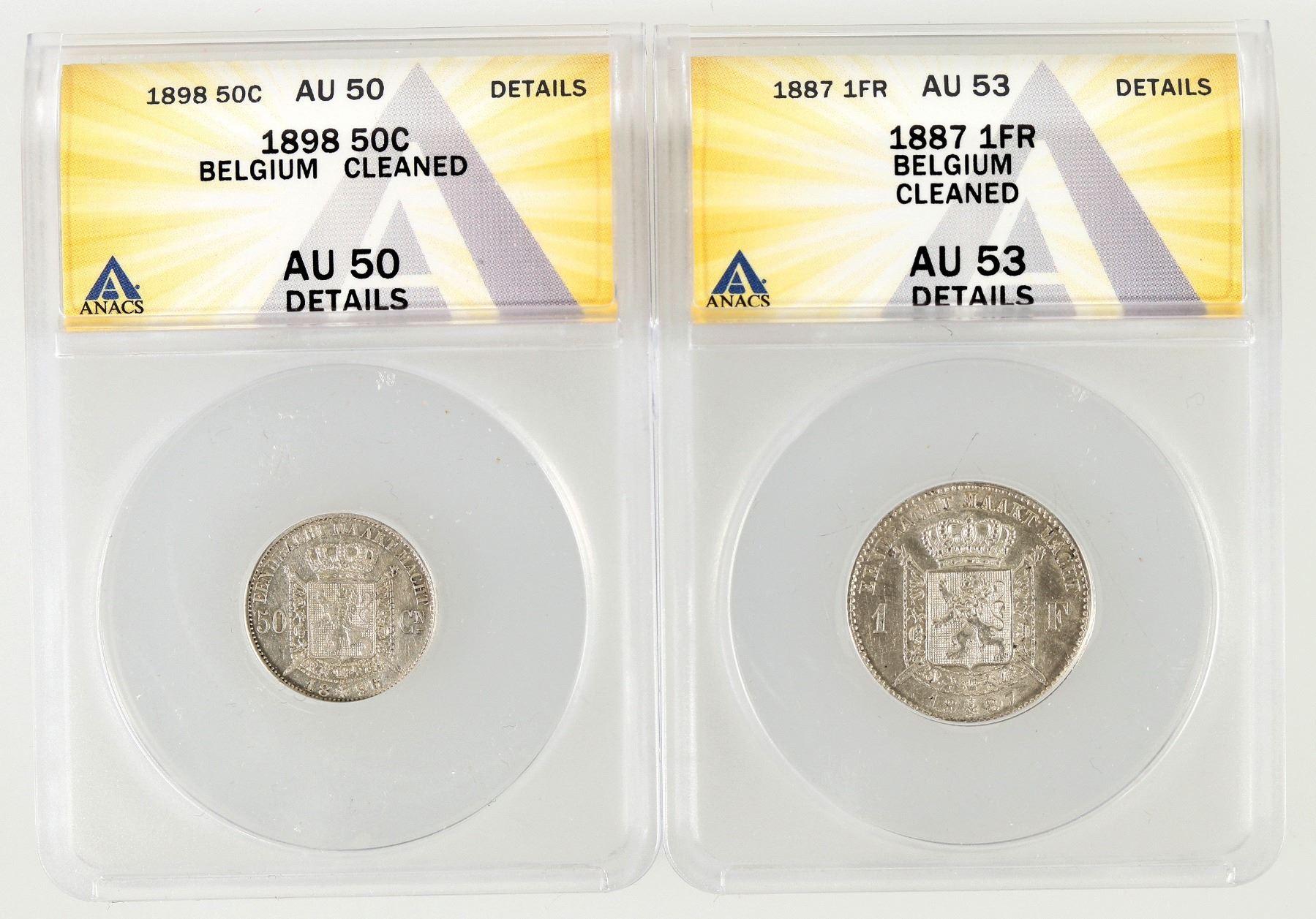 Two ANACS graded coins from Belgium: 1) 1887 one franc AU 53 details, cleaned; 2) 1898 fifty cent, AU 50 details, cleaned.