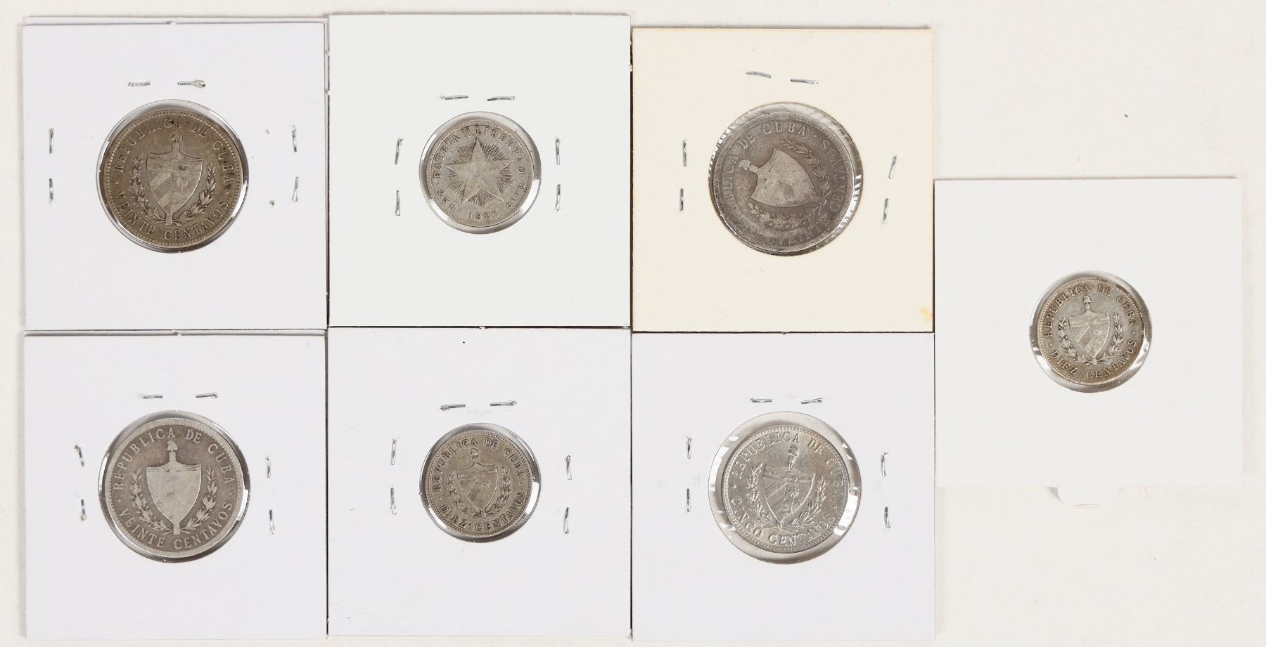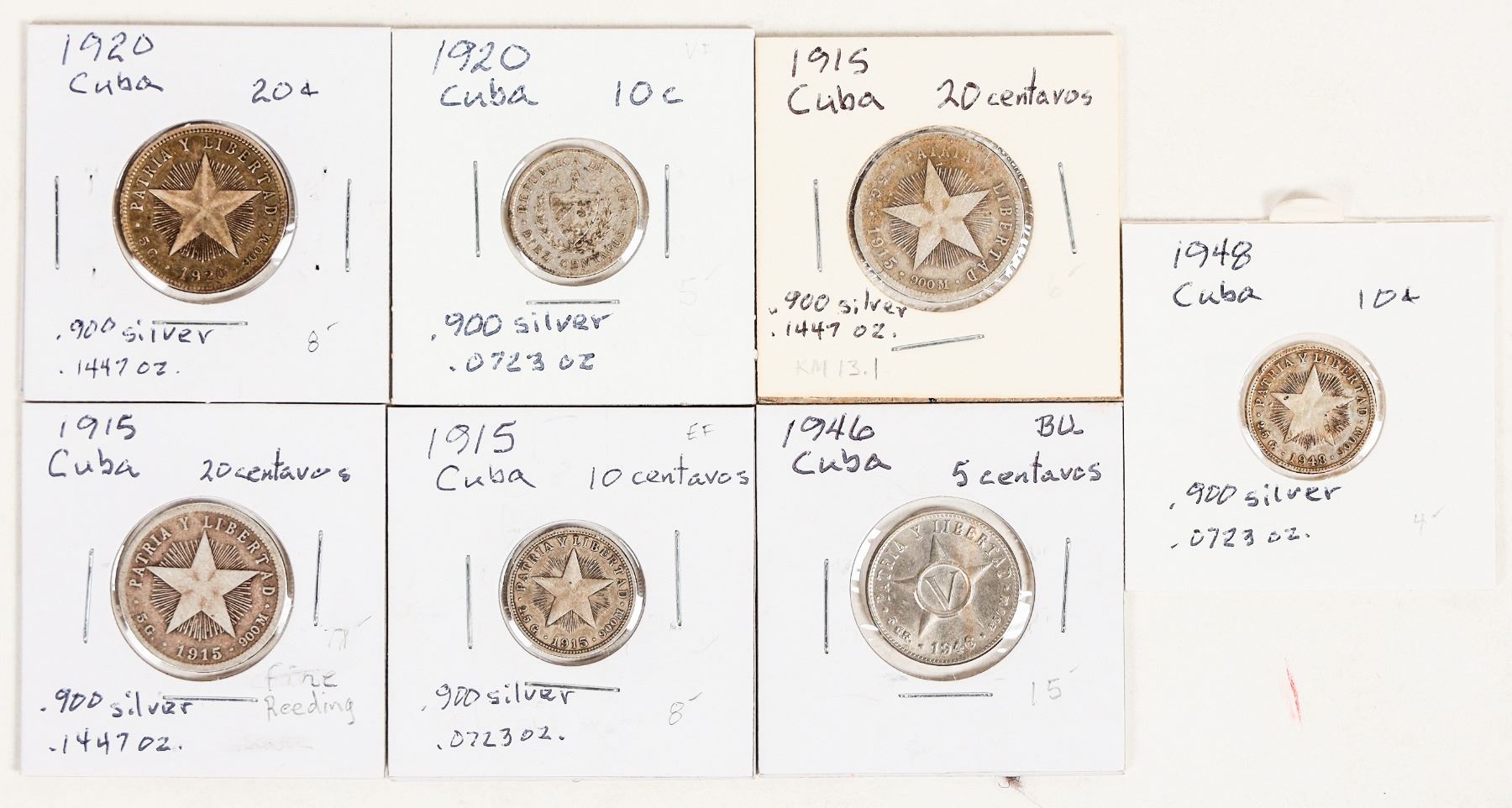 Seven coins of Cuba 1915-1948: 1915 10 centavos; 1915 20 centavos (2); 1920 20 centavos; 1920 10 centavos; 1946 5 centavos; 1948 10 centavos.