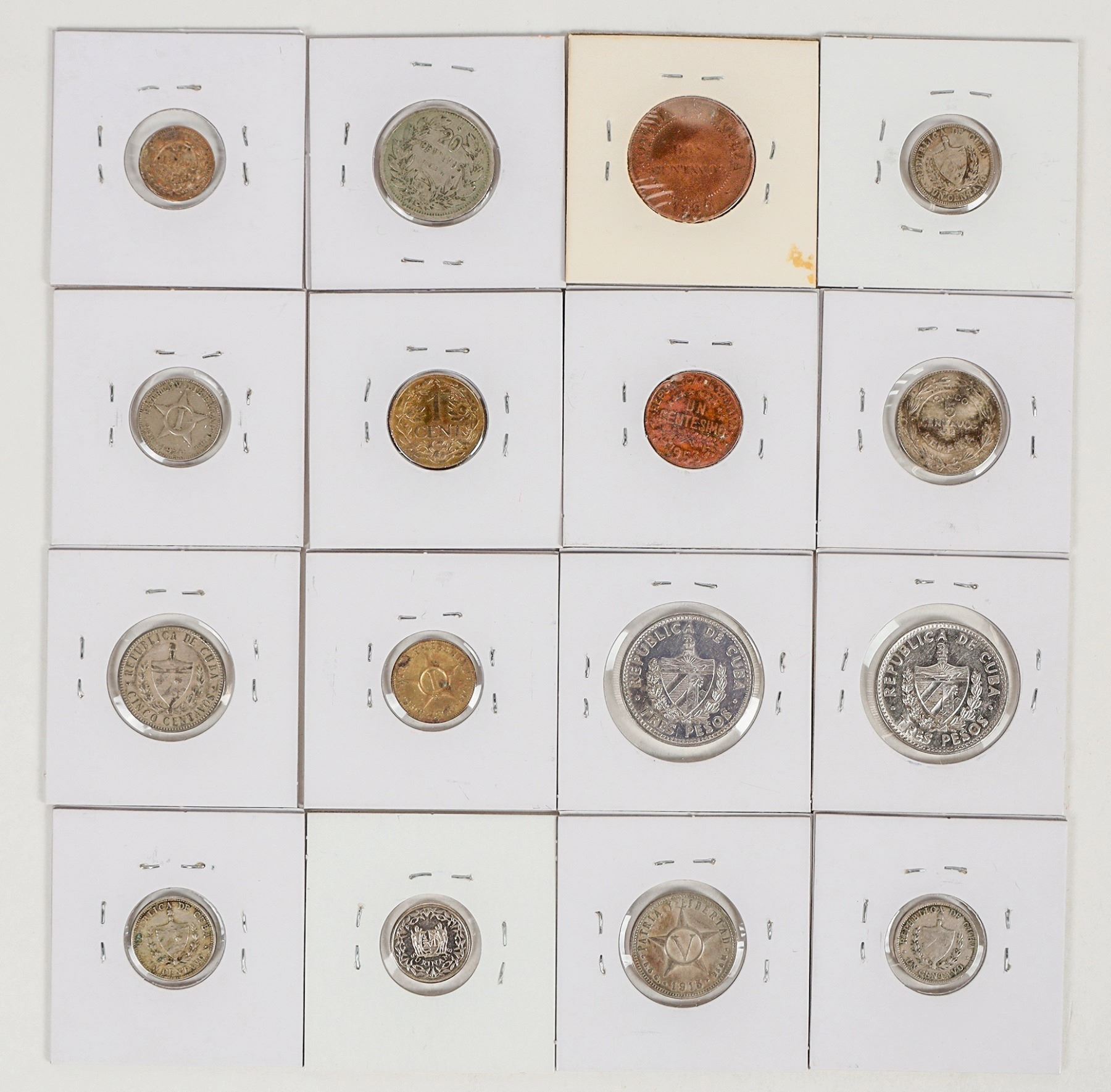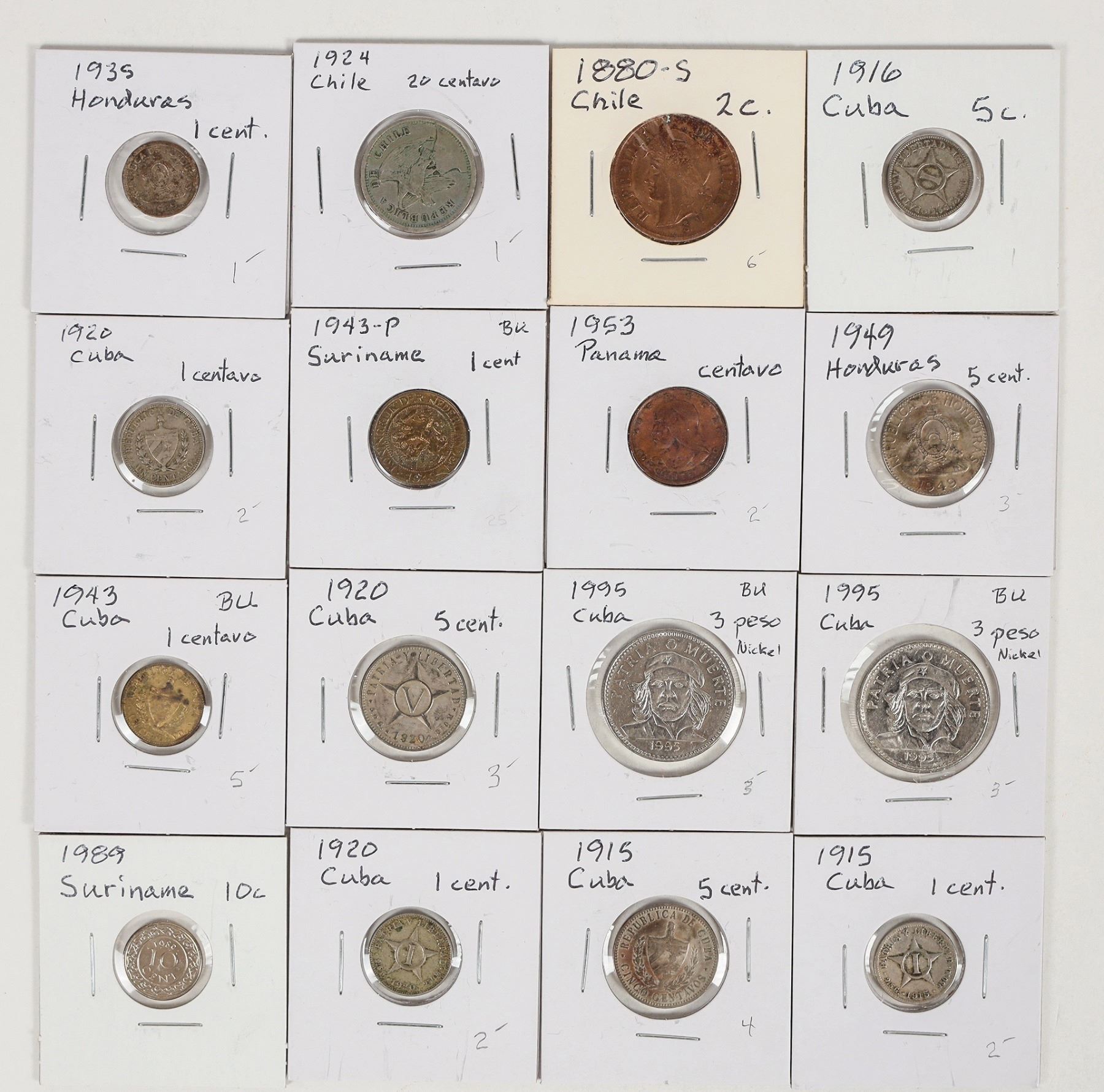 Seven miscellaneous coins and nine coins of Cuba. Suriname: 1943 1c.; 1989 10c. Panama 1953 centavo; Chile: 1880-S 2c.; 1924 20 c. Honduras 1935 1c.; 1949 5c. Cuba: 1915 1c.; 1915 5c.; 1916 5c.; 1920 1c. (2); 1920 5c.; 1943 1c.; 1995 3 peso (2).
