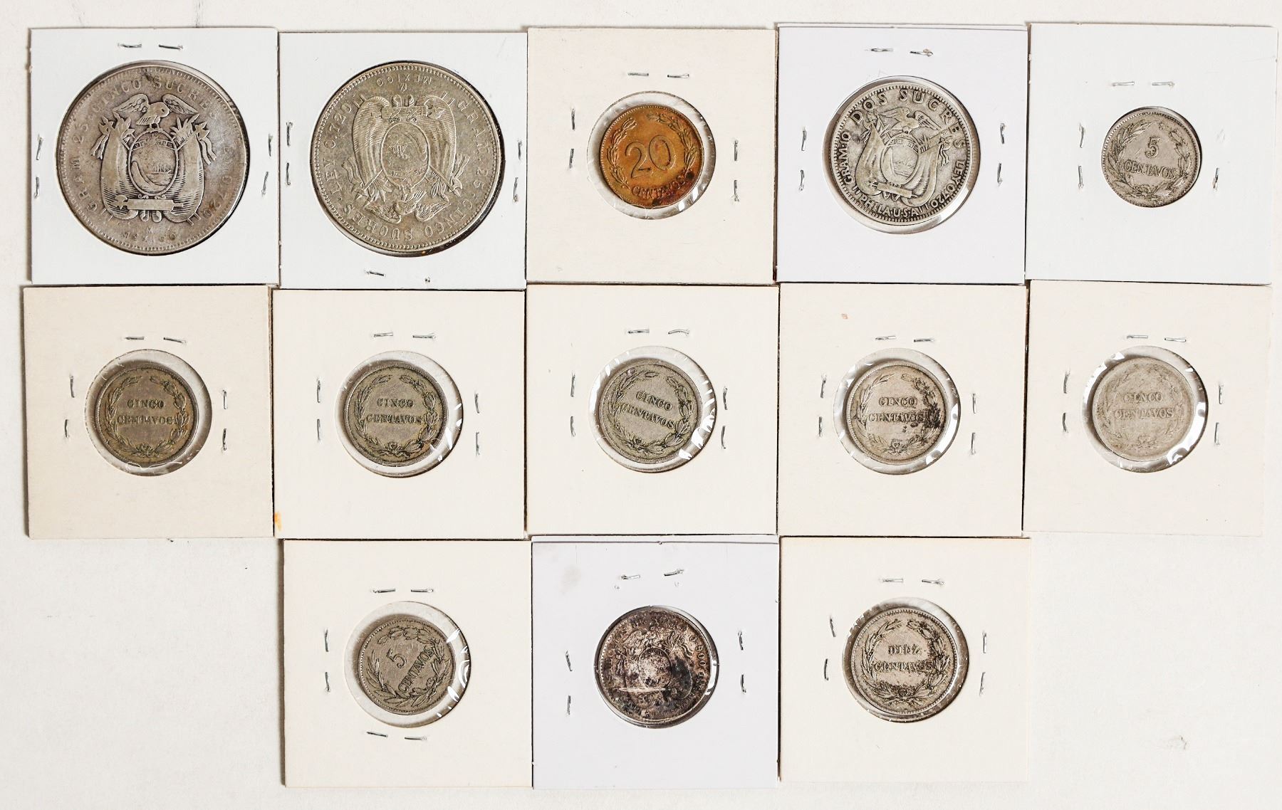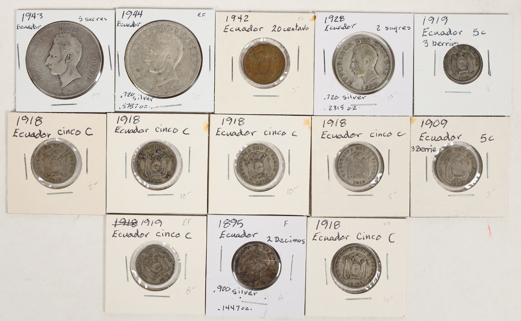 Thirteen coins of Ecuador: 1895 2 decimos; 1909 cinco centavos; 1918 cinco centavos (5); 1919 cinco centavos (2); 1928 2 sucres; 1942 20 centavos; 1943 5 sucres; 1944 5 sucres.