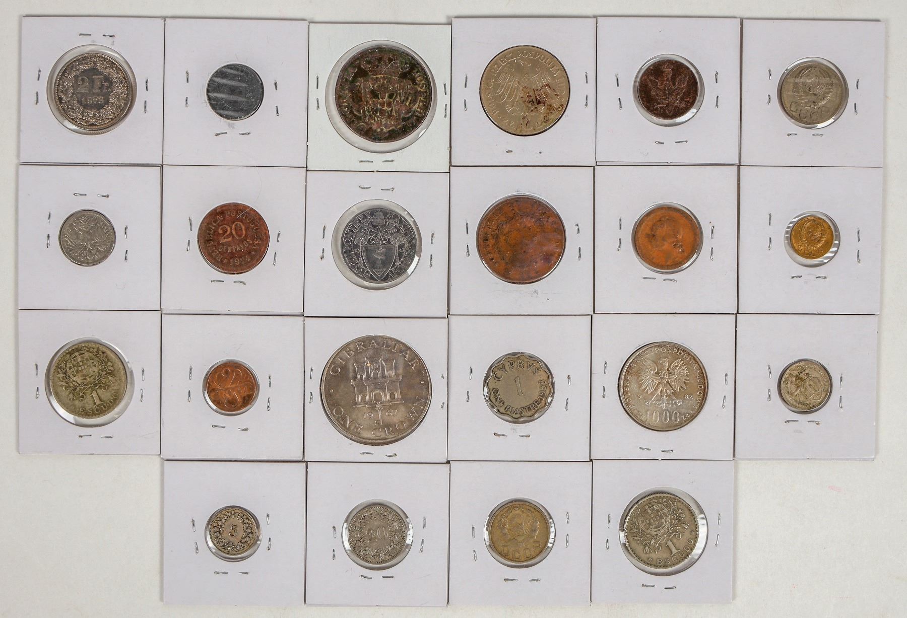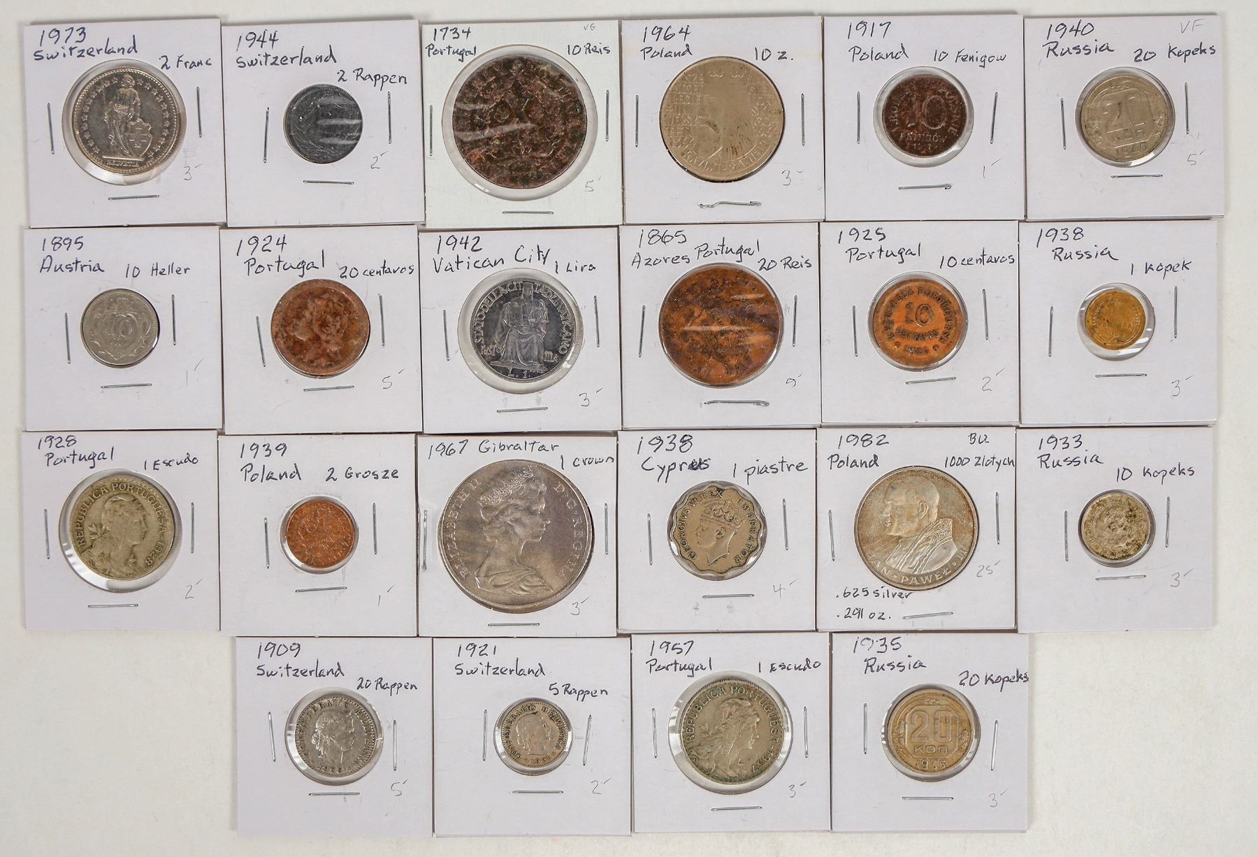 Twenty two coins from nine different countries: 1895 Austria 10 heller; 1938 Cyprus 1 piastre; 1967 Gibraltar 1 crown; 1942 Vatican City 1 lira. Poland: 1917 10 fenigow; 1964 10z. Switzerland: 1909 20 rappen; 1921 5 rappen; 1944 2 rappen; 1973 2 franc. Russia: 1933 10 kopek; 1935 20 kopek; 1938 1 kopek; 1940 20 kopek. Portugal: 1734 10 reis; 1865 20 reis; 1924 20 centavos; 1925 10c.; 1928 1 escudo; 1957 1 escudo. Poland: 1939 2 grosze; 1982 1000 zlotych.