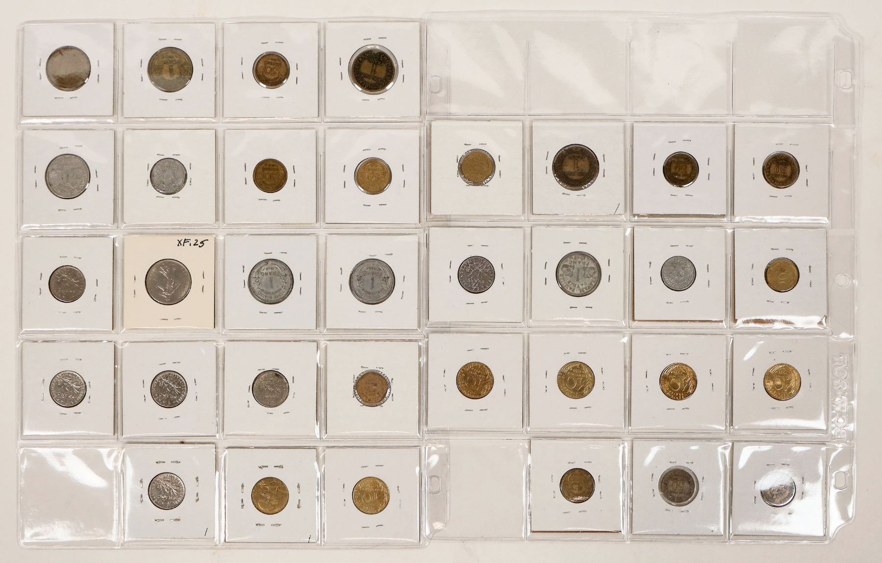 Thirty four French coins in 2 x 2 cardboard with Krause/Mishler catalog numbers, dates, denomination. Dates range from 1922-2000. One franc or smaller denominations.