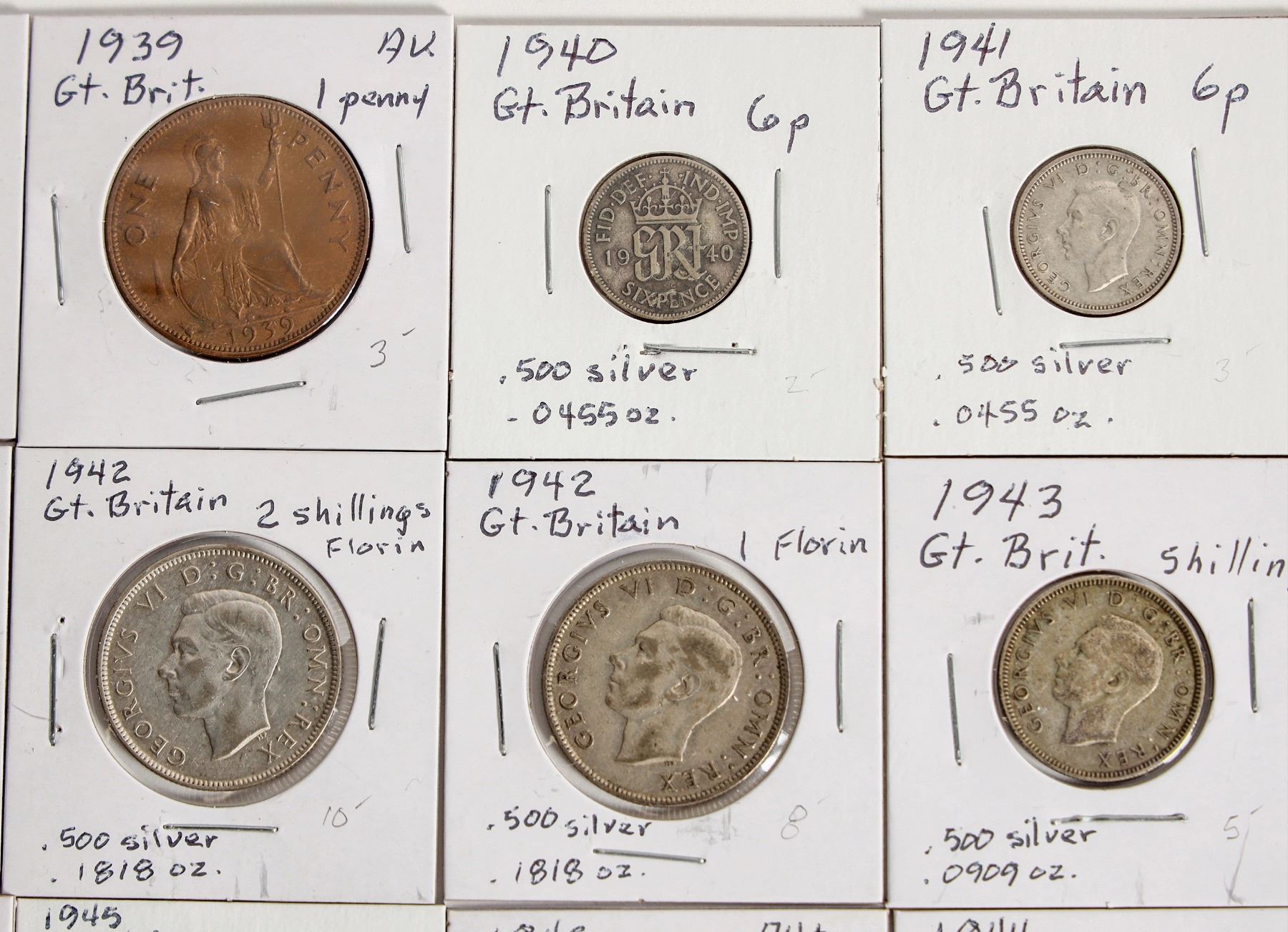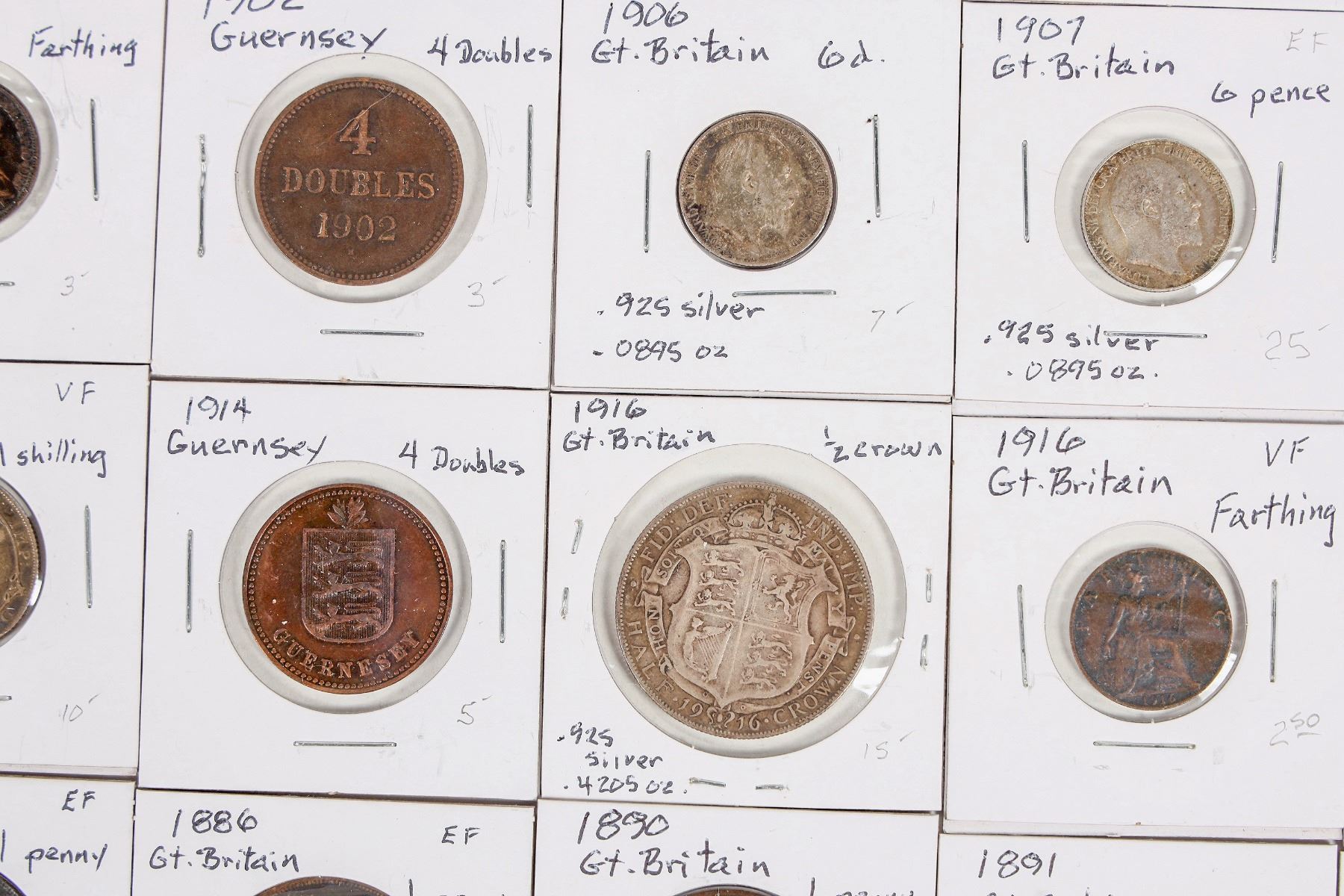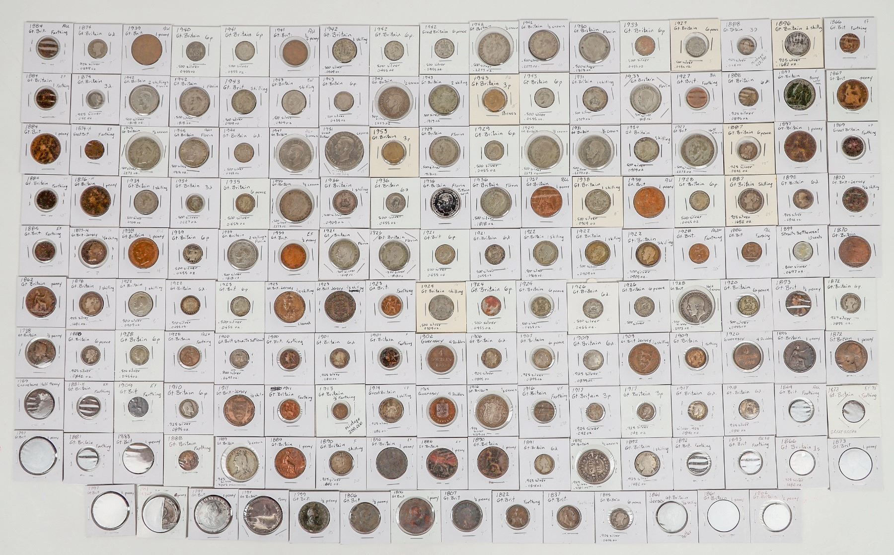Large collection of 166 coins of Great Britain 1738-1953. Eight coins from the 18th century: 1738 1/2 penny; 1789 1/2 penny; 1797 penny (5); 1799 1/2 penny. Fifty nine coins from the 19th century: 1/2 pennies, pennies, farthings, shillings, 6 pence, 1/2 crowns, 3 pence. Ninety nine coins from the 20th century: farthing, six pence, shilling, 1/3 farthing, three pence, florin, 1/12 shilling, 1/2 crown, crown, 1/2 penny, two shillings.