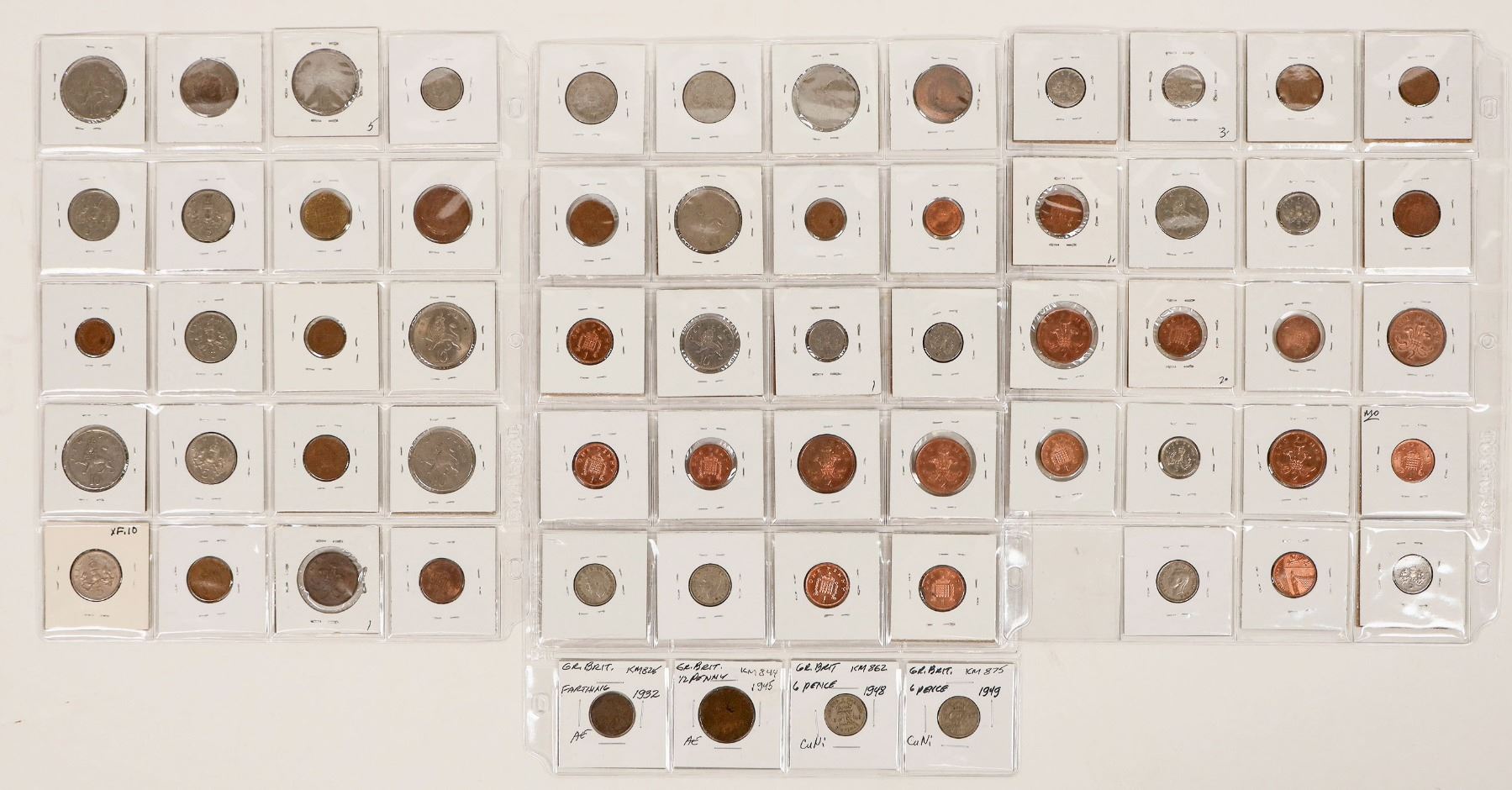 Sixty three English coins in 2 x 2 cardboard with Krause/Mishler catalog numbers, date, denomination. Dates from 1932-2008. Smaller denominations.