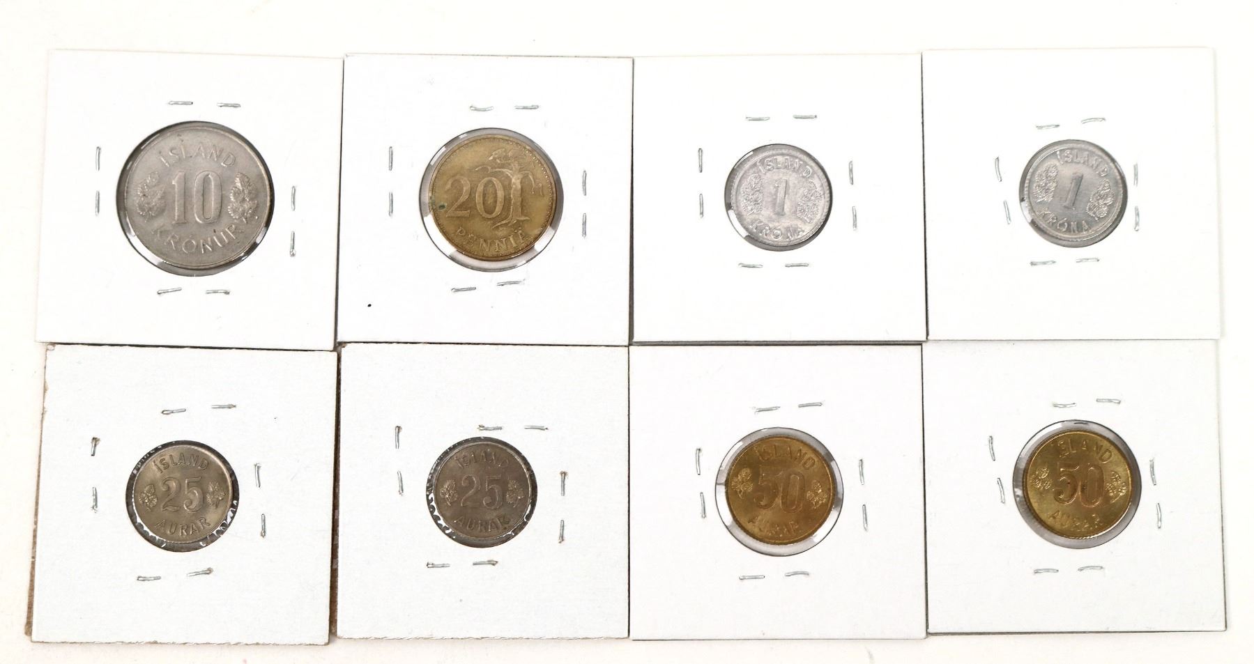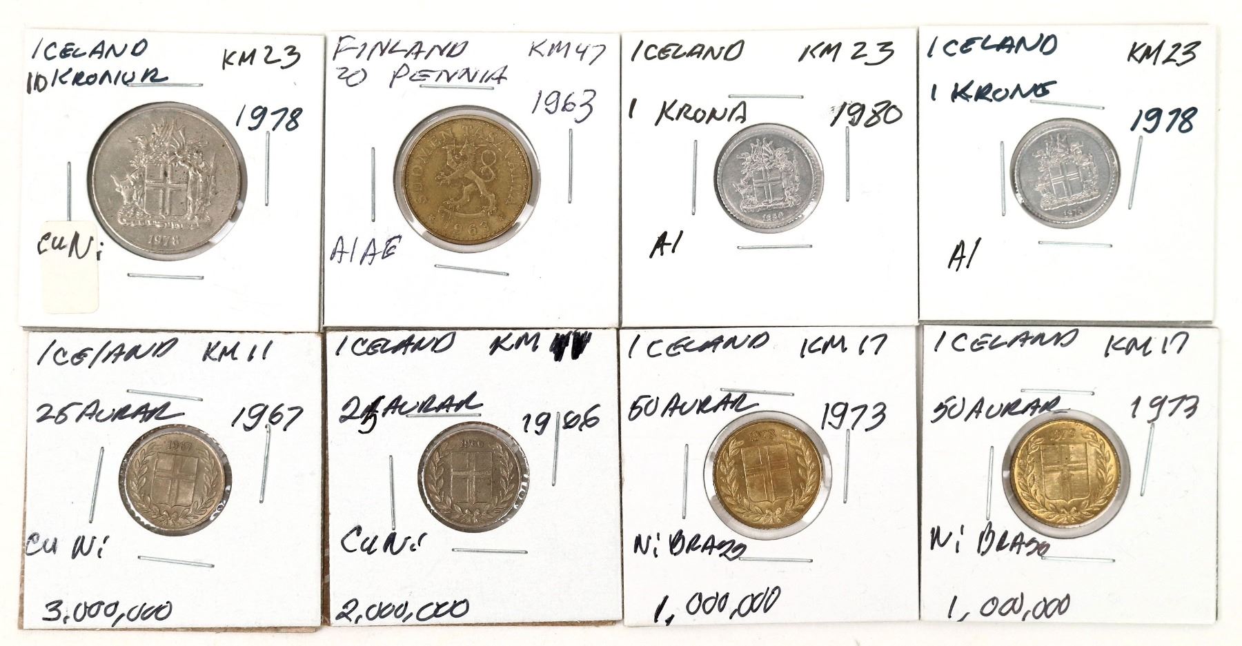 Eight coins in 2 x 2 cardboard with catalog number, date and denomination. Finland 1963 20 pennia; Iceland (7): dates 1966-1980, various denominations.