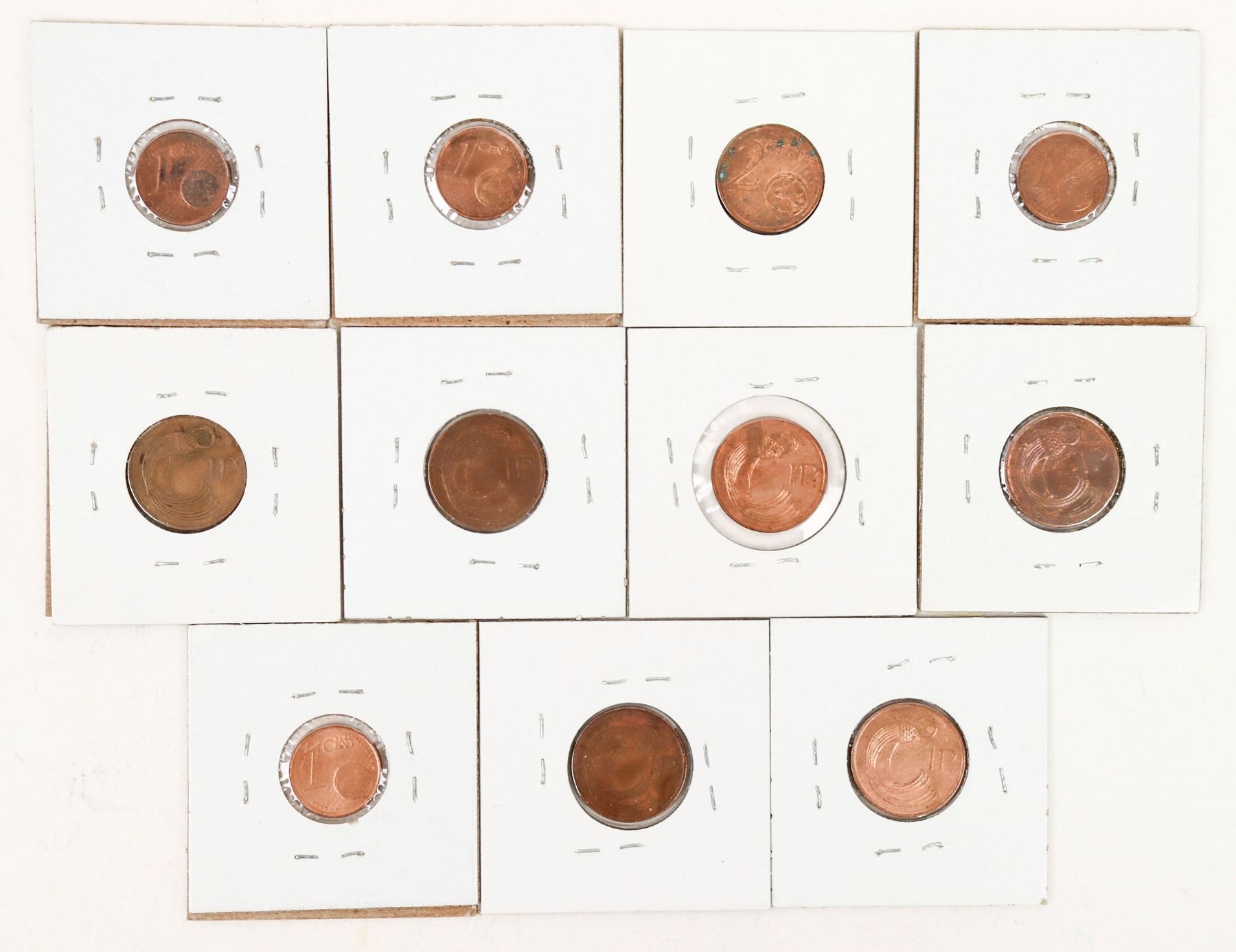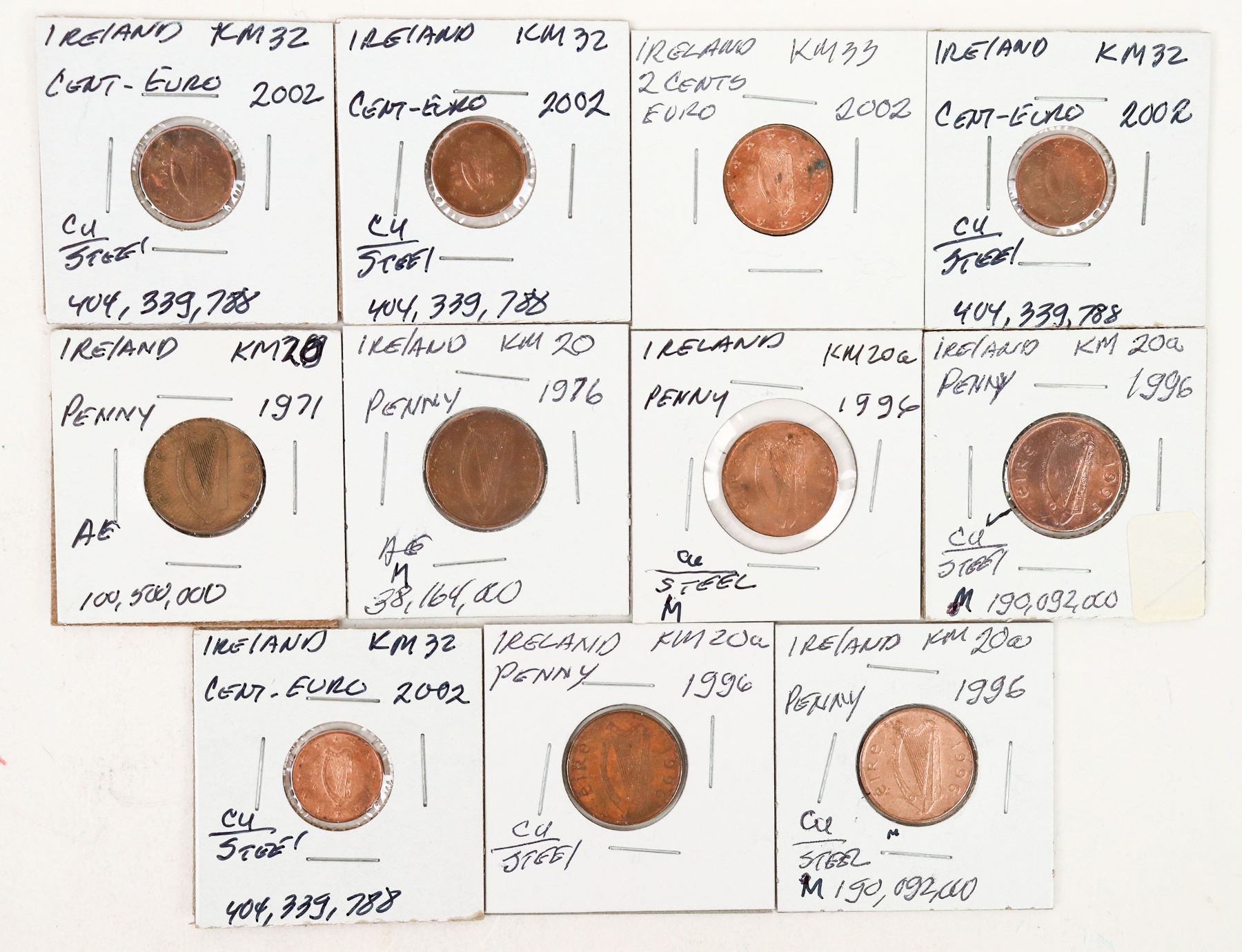 Eleven Irish coins in 2 x 2 cardboard with catalog number, date and denomination: 1971 penny; 1976 penny; 1996 penny (4); 2002 cent-euro (5).