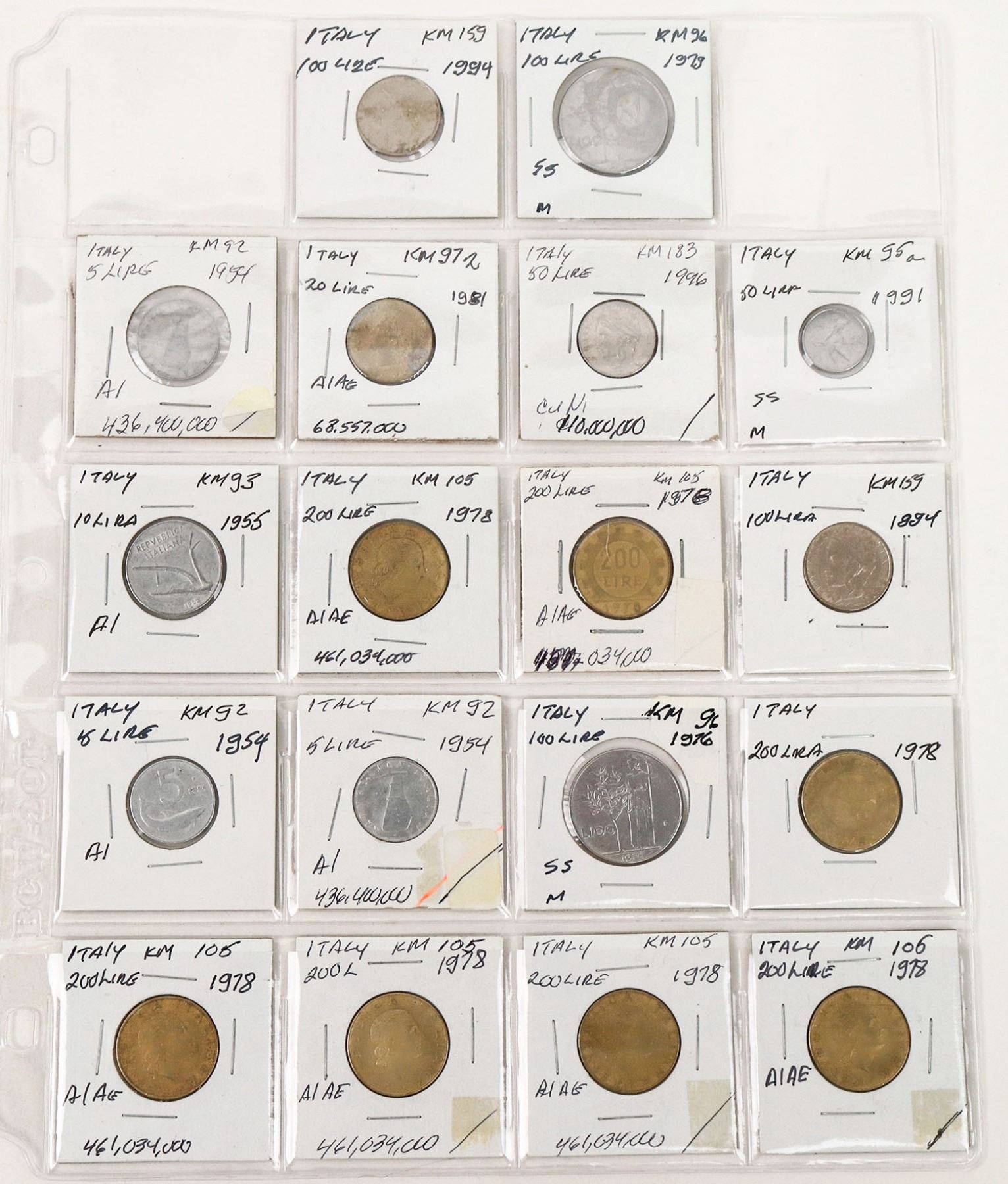 Eighteen Italian coins in 2 x 2 cardboard with KM (Krause/Mishler) number, date and denomination. Dates from 1954-1996. 5, 10, 20, 50, 100 and 200 lira.