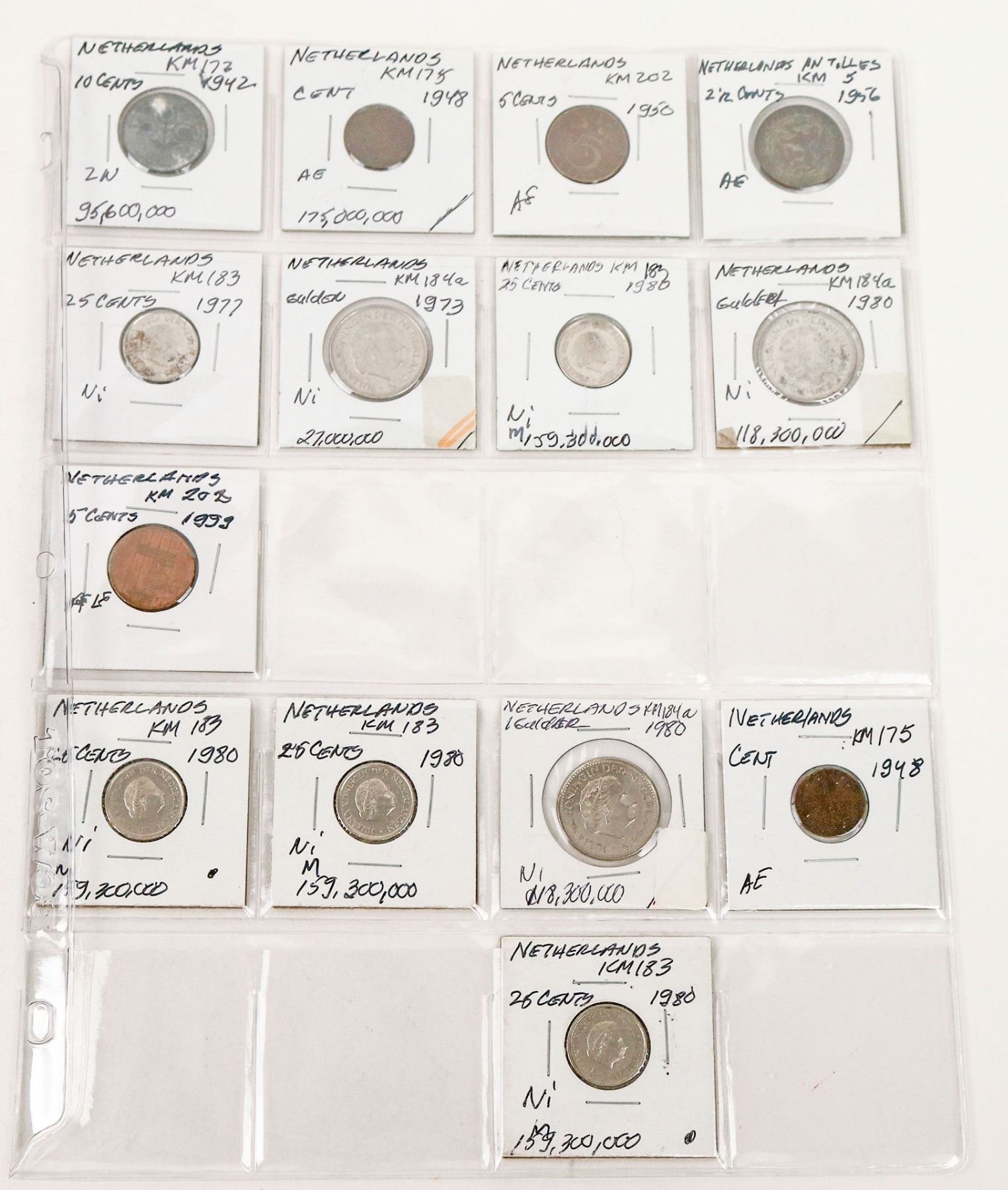 Fourteen coins from the Netherlands in 2 x 2 cardboard with KM (Krause/Mishler) number, date and denomination on each one. Dates from 1942-1992. One cent through 25 cent; one guilder.