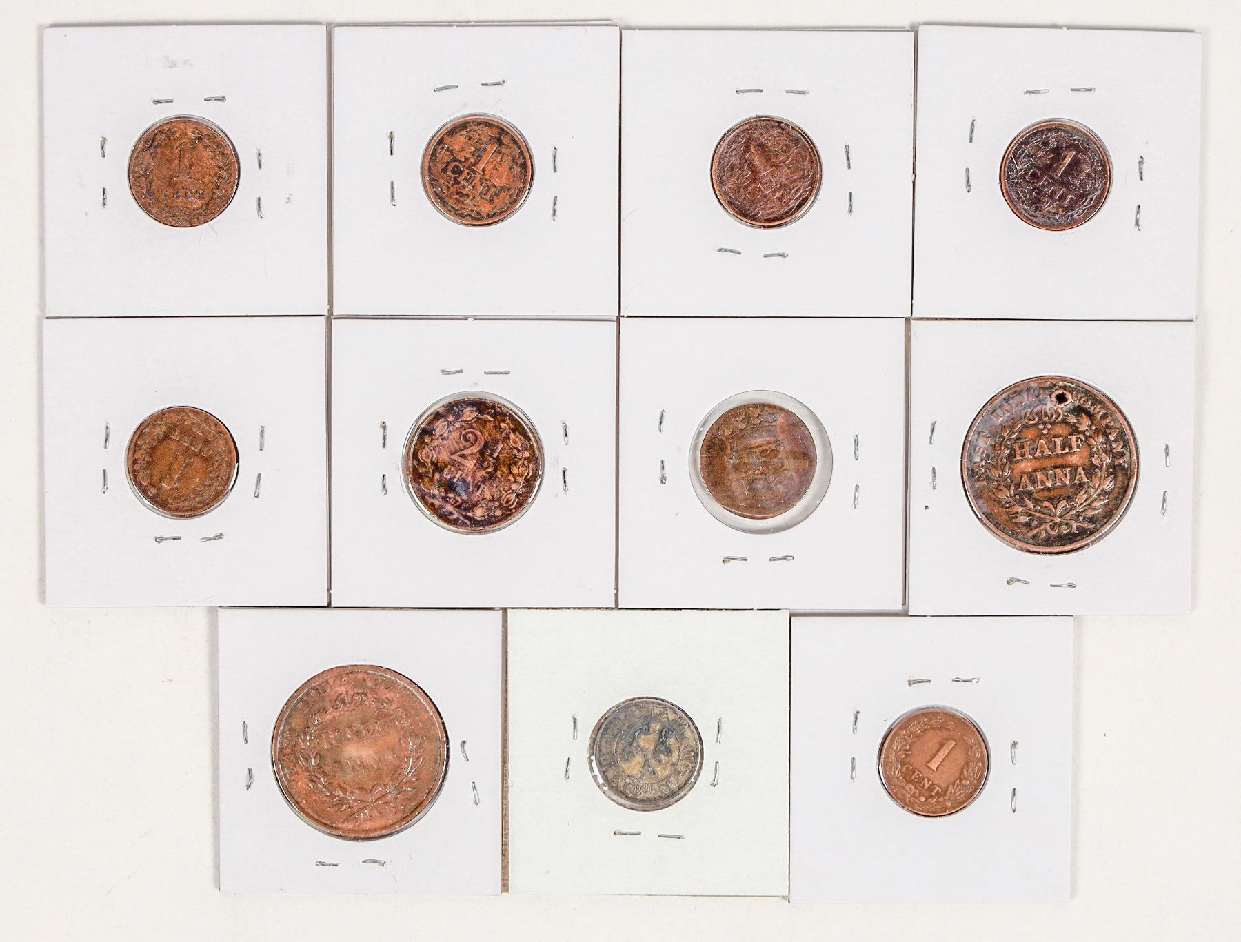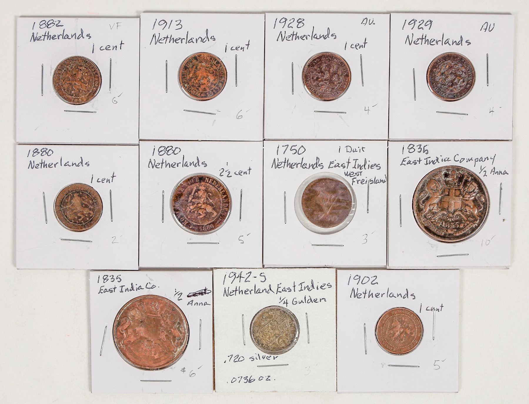 Eleven Dutch coins: 1750 Netherlands East Indies 1 duit; 1835 East India Co. 1/2 Anna (2: one holed); 1880 1c.; 1880 2 1/2 c.; 1882 1c.; 1902 1c.; 1913 1c.; 1928 1c.; 1929 1c.; 1942 1/2 Gulden.