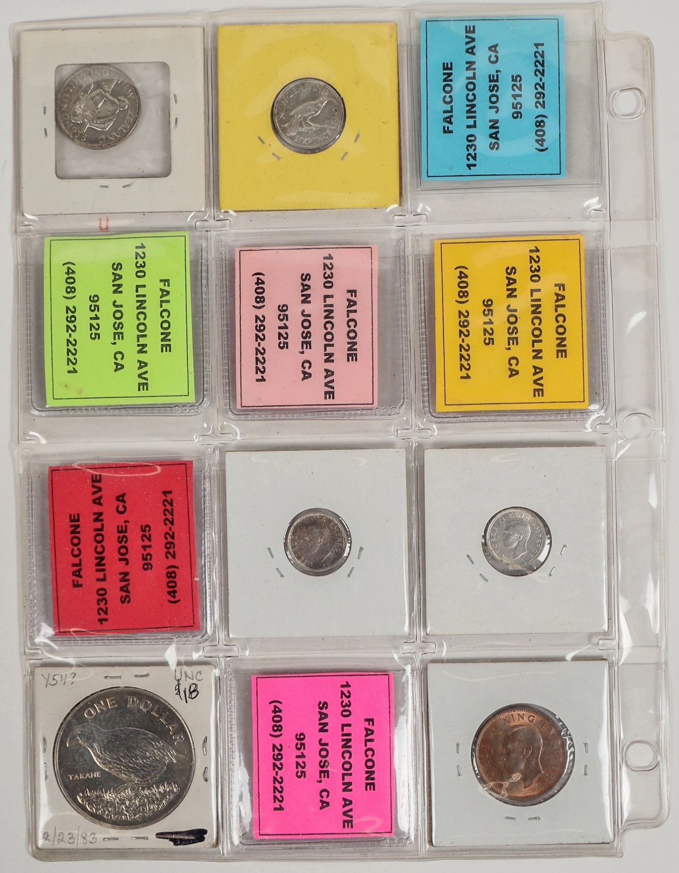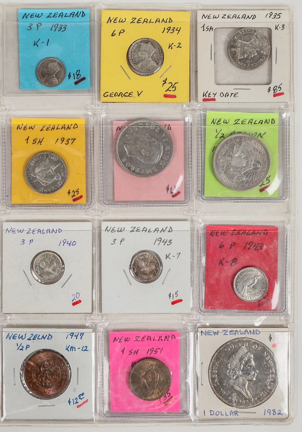 Twelve coins of New Zealand: 1933 three pence; 1934 six pence; 1935 shilling; 1937 shilling; 1937 half crown; 1940 half crown; 1940 three pence; 1943 three pence; 1943 six pence; 1947 half penny; 1951 shilling; 1982 dollar.