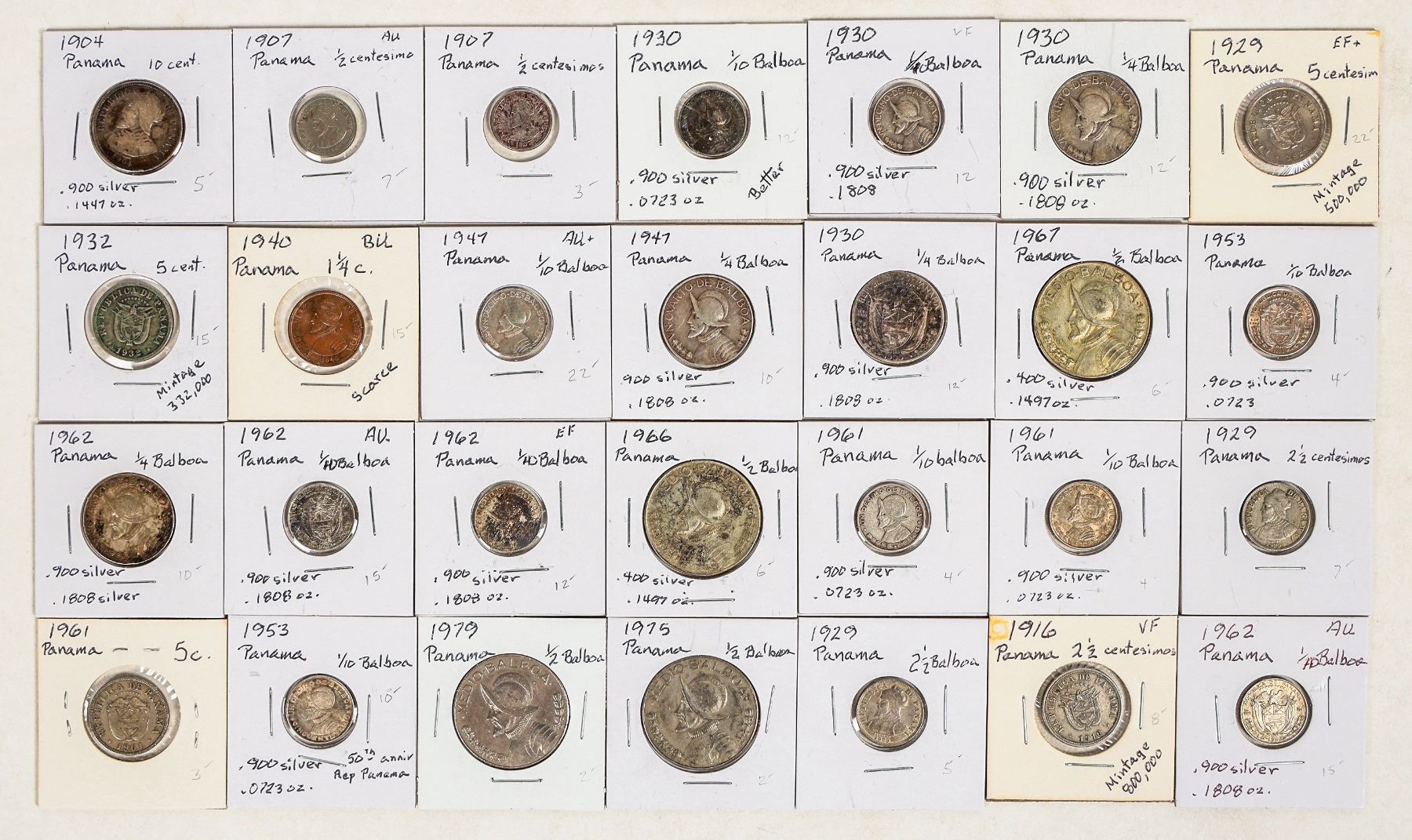 Twenty eight coins from Panama: 1904 10 c.; 1907 1/2 c. (2); 1916 2 1/2 c.; 1929 5c.; 1929 2 1.2 Balboa (2); 1930 1/4 Balboa (2); 1930 1/10 Balboa (2); 1932 5c.; 1940 1 1/4c. (scarce; AU-BU); 1947 1/10 Balboa; 1947 1/4 Balboa; 1953 1/10 Balboa (2); 1961 5c.; 1961 1/10 Balboa (2); 1962 1/4 Balboa; 1962 1/10 Balboa (3); 1966 1/2 Balboa; 1967 1/2 Balboa; 1975 1/2 Balboa; 1979 1/2 Balboa.