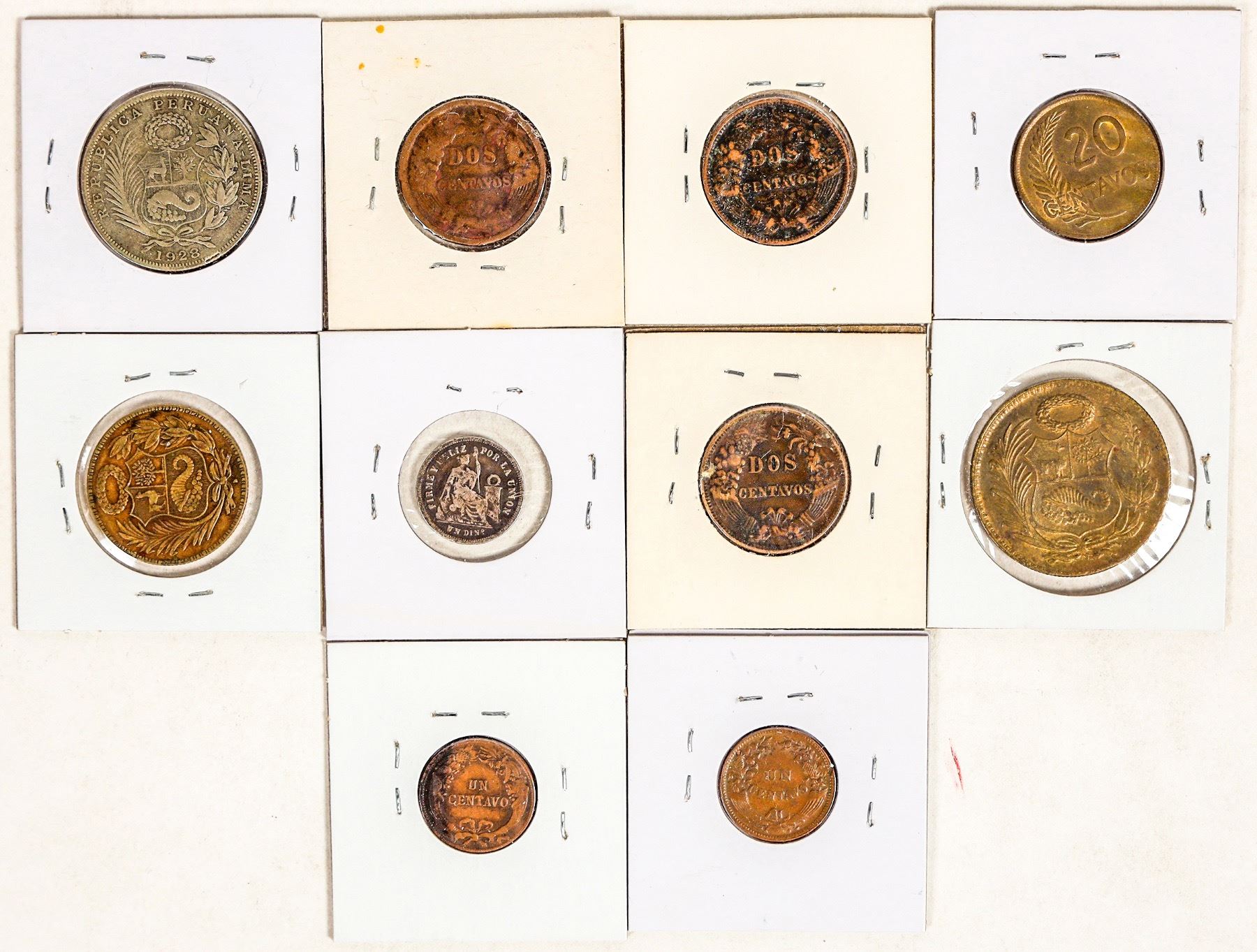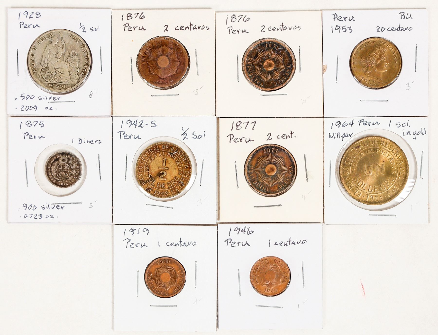 Ten coins of Peru: 1875 1 dinero; 1876 2 centavos (2); 1877 2 centavos; 1919 1 centavo; 1928 1/2 sol; 1946 1 centavo; 1942 1/2 sol; 1953 20 centavo; 1964 1 sol.