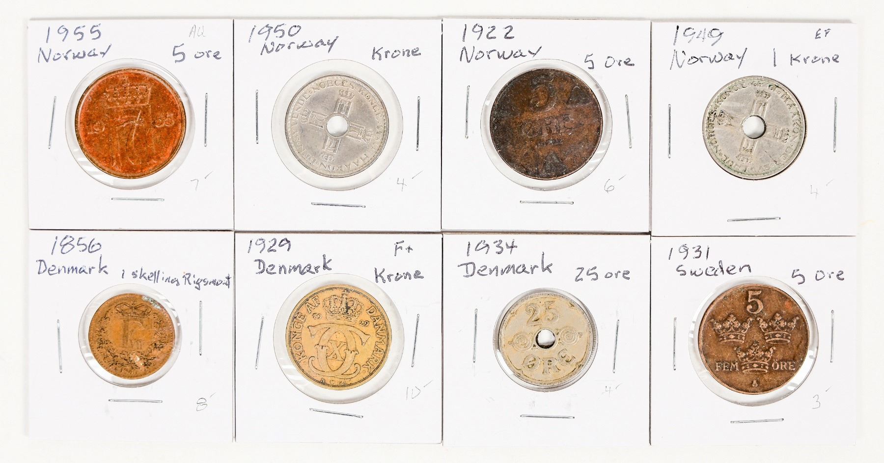 Eight coins from northern Europe: Sweden 1931 5 ore; Denmark 1856 1 skilling; 1929 krone; 1934 25 ore. Norway: 1922 5 ore; 1949 1 krone; 1950 1 krone; 1955 5 ore.