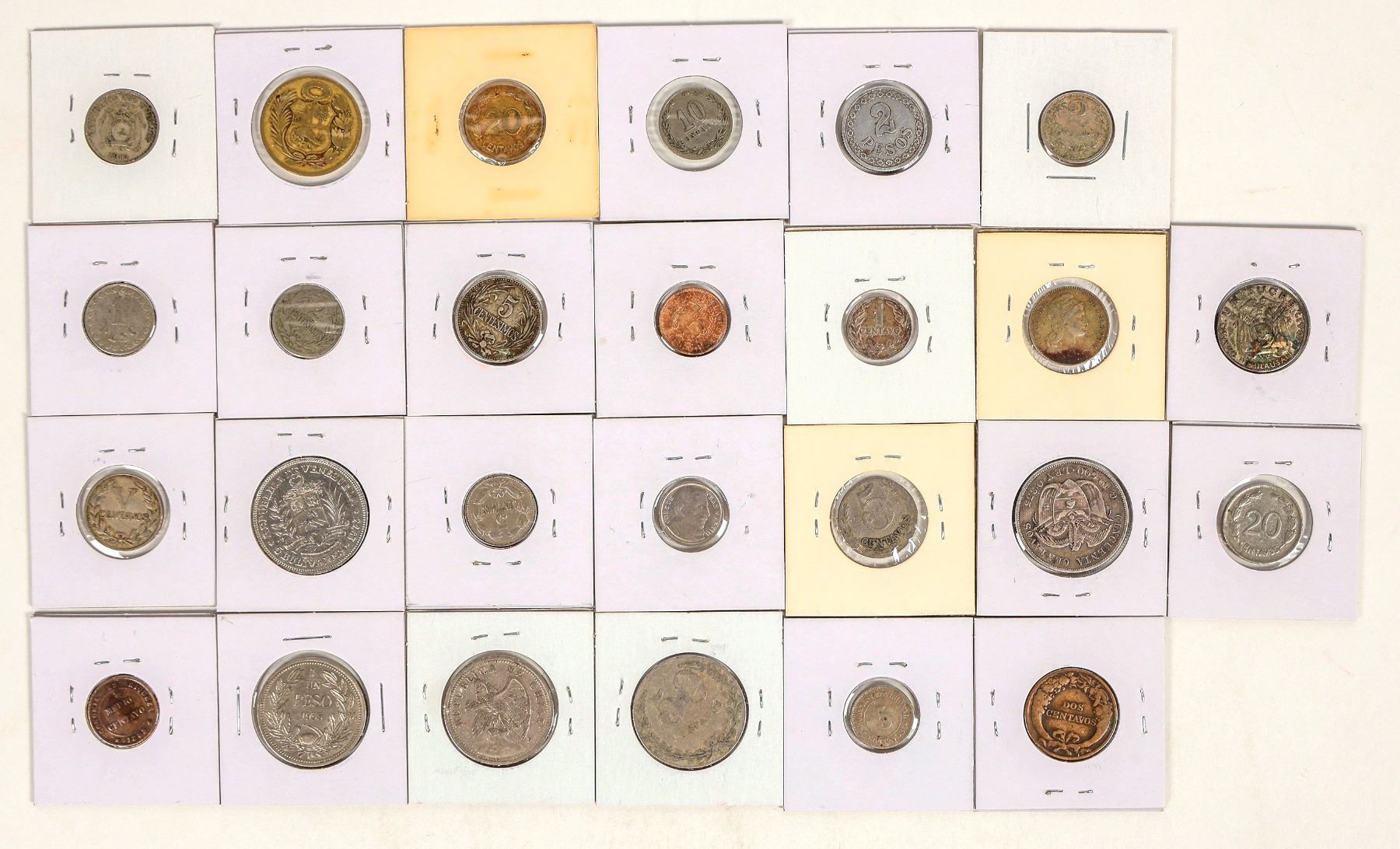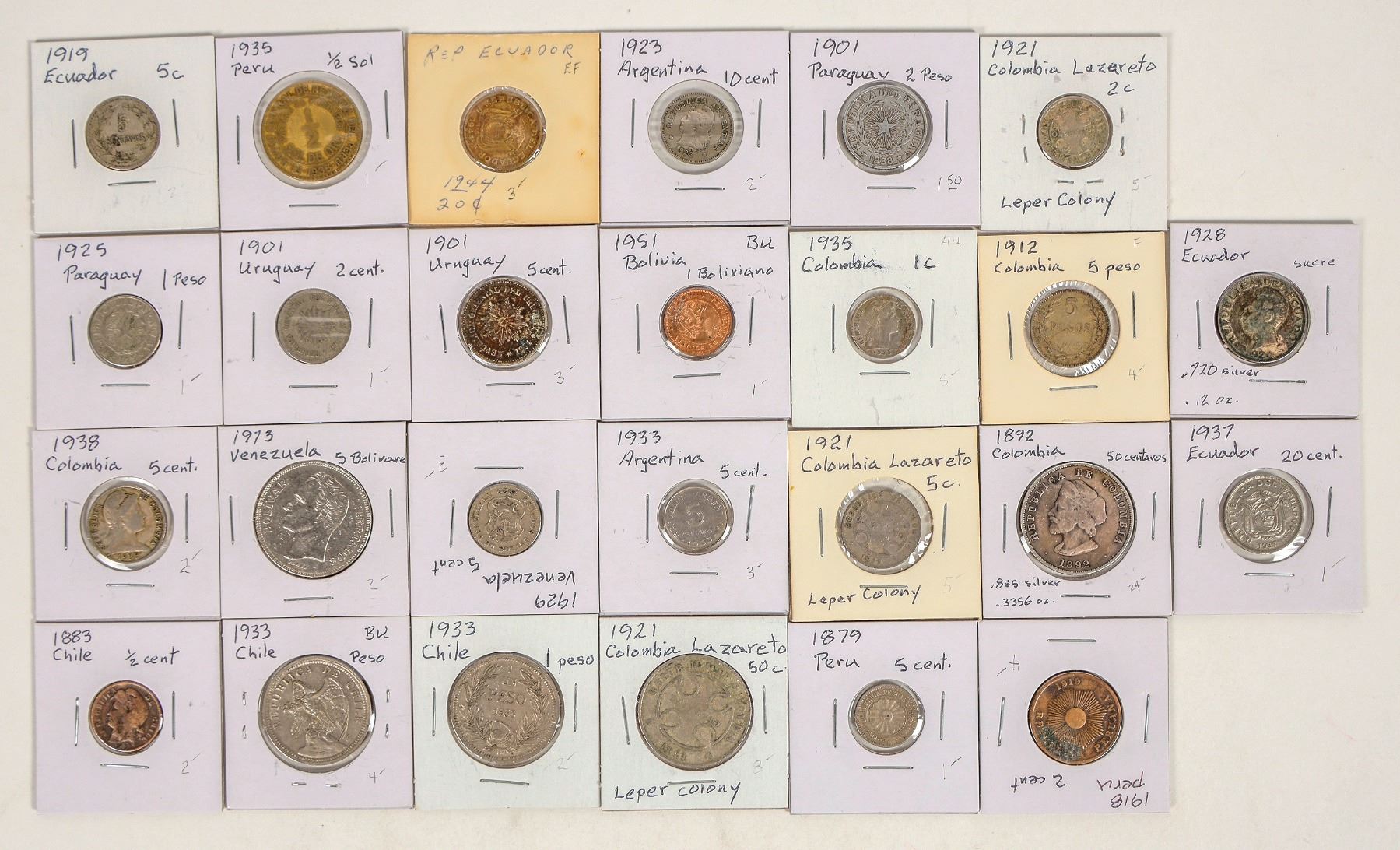 Coins from nine different South American countries: Bolivia 1951 1 boliviano. Uruguay: 1901 2 centavo; 1901 5 centavo. Paraguay: 1901 2 peso; 1925 1 peso. Argentina: 1923 10 cent.; 1933 5 cent. Venezuela 1929 5 cent.; 1973 5 bolivares. Peru: 1879 5 cent.; 1918 2 cent.; 1935 1/2 sol. Ecuador: 1919 5 cent.; 1928 sucre; 1937 20 cent.; 1944 20 cent. Chile: 1883 1/2 cent; 1933 1 peso (2: one BU). Columbia: 1892 50 cent.; 1912 5 peso; 1921 50c.; 1921 5 c.; 1921 2 cent.; 1935 1 cent.; 1938 5 cent.