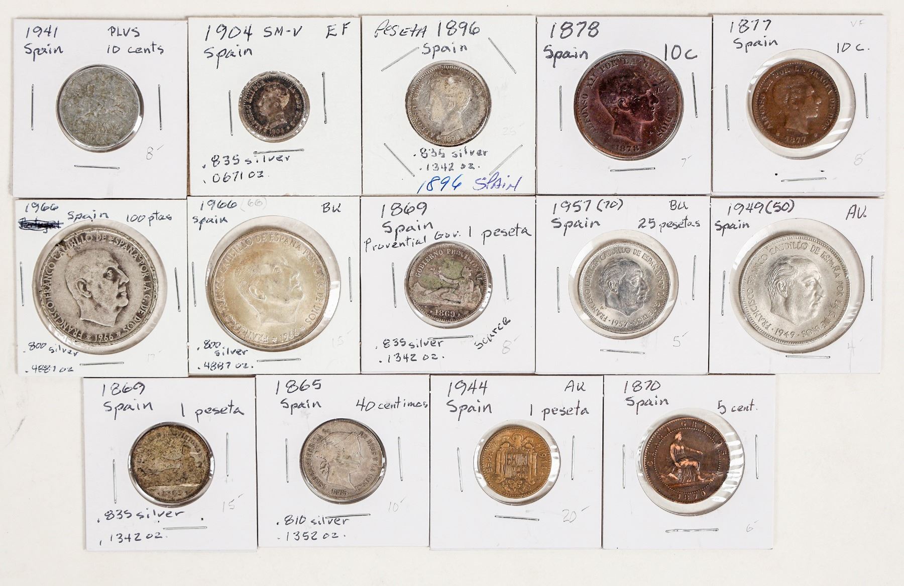 Fourteen Spanish coins: 1865 40 cent; 1869 1 peseta (2); 1870 5 c.; 1877 10 c.; 1878 10c.; 1896 1 peseta; 1904 50c.; 1941 10c.; 1944 1 peseta; 1949 50 peseta; 1957 25 peseta; 1966 100 pesetas (2). About two ounces of silver total.
