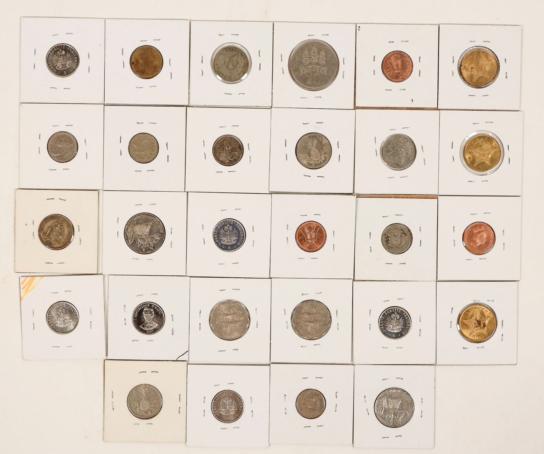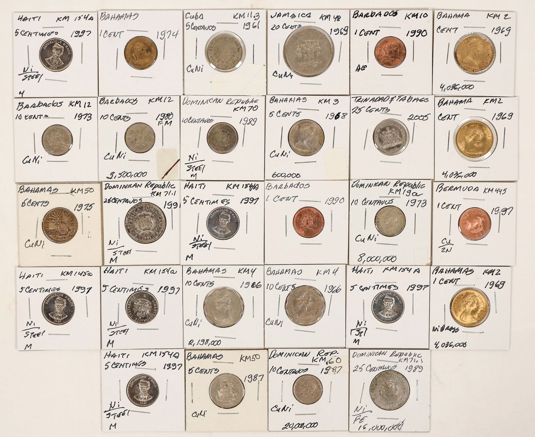 Twenty eight coins from countries of the Caribbean in 2 x 2 cardboard with catalog numbers, dates and denominations: Trinidad & Tobago; Cuba; Jamaica; Haiti (6); Dominican Republic (5); Bermuda; Bahamas (9); Barbados (4). Dates range from 1961 through 2005. One, five, ten, twenty five cent pieces.