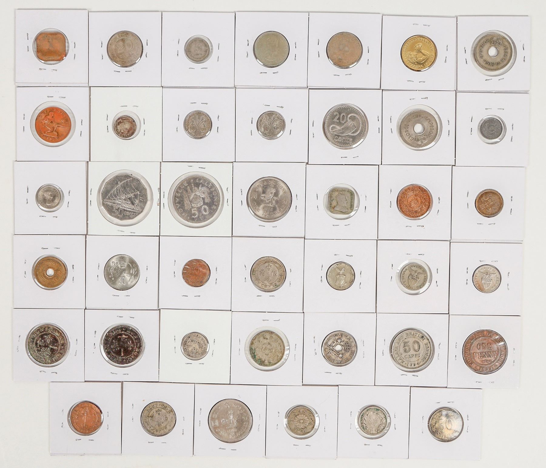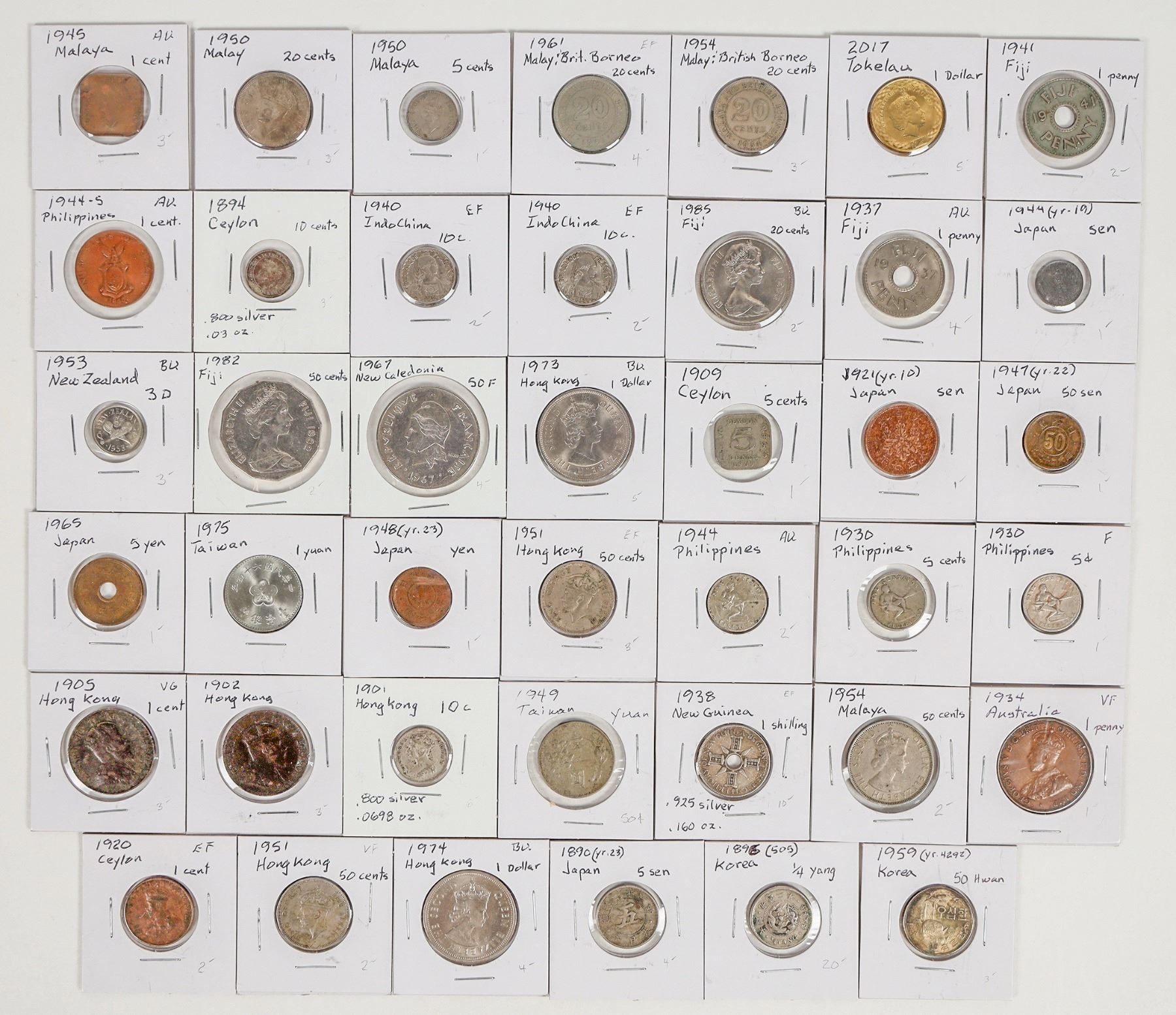 Coins from 13 countries around the Pacific Ocean. New Zealand: 1953 3 pence. Fiji: 1937 1 penny; 1941 1 c.; 1982 50c.; 1985 20c. Indochina: 1940 10c. (2). Ceylon: 1894 10c.; 1909 5c. 1920 1c. New Caledonia 1967 50 franc. New Guinea 1938 1 shilling. Australia 1934 1 penny. Korea: 1896 1/4 yang; 1959 50 hwan. Taiwan: 1949 yuan; 1975 yuan. Tokelau: 2017 1 dollar. Philippines: 1930 5c (2); 1944 5c.; 1944-S 1c. Japan: 1890 5 sen; 1921 sen; 1944 sen; 1947 50 sen; 1948 yen; 1965 5 yen. Hong Kong: 1901 10c; 1902 1c.; 1905 1c.; 1951 50c.(2); 1973 1 dollar (BU); 1974 1 dollar (BU). Malaya: 1945 1c.; 1950 20c.; 1950 5c.; 1954 50c.; 1954 20 c. 1961 20c.