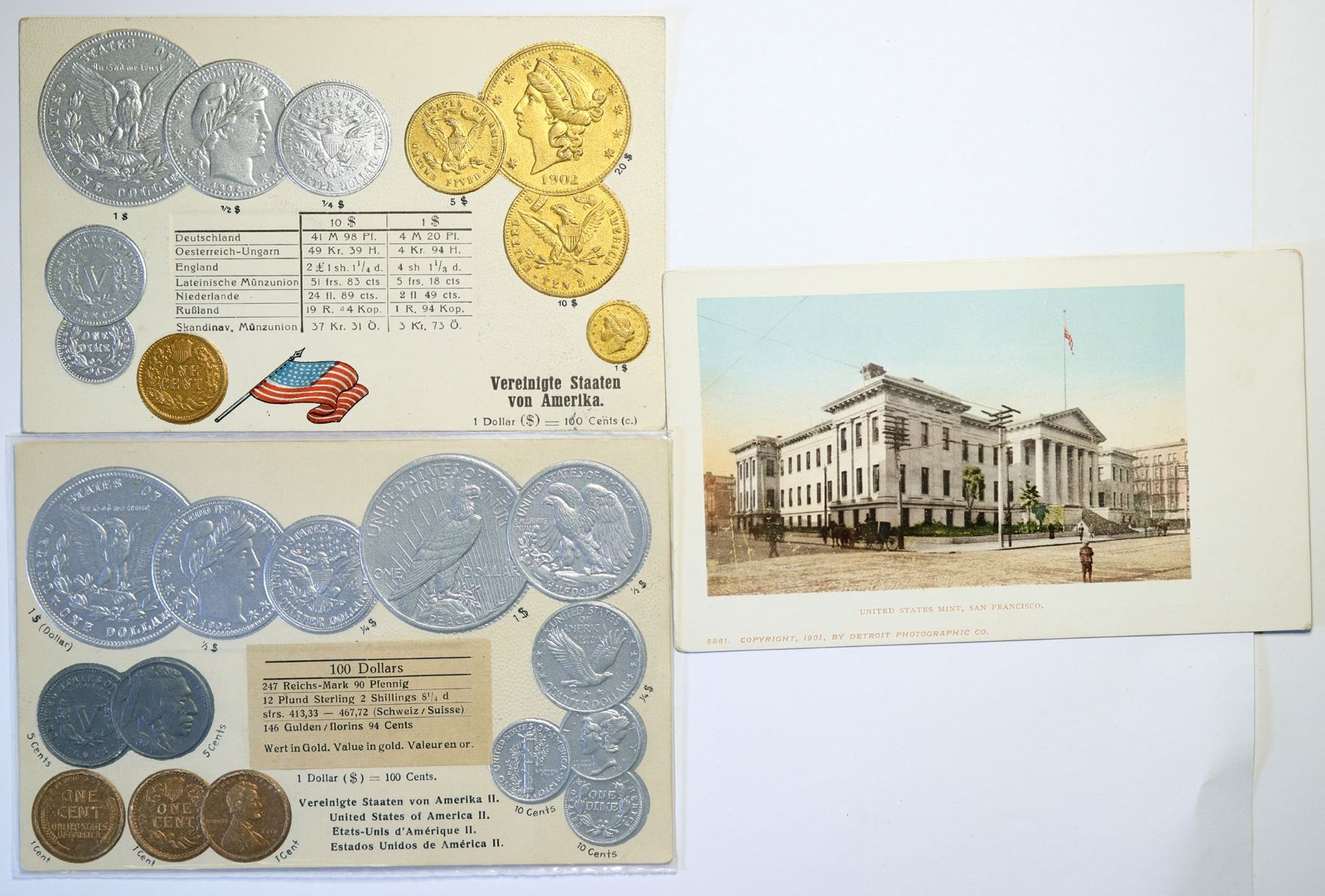 Lot of three: one of the San Francisco Mint, 1901 and two cards printed in Germany with the various denominations of U.S. Coinage.