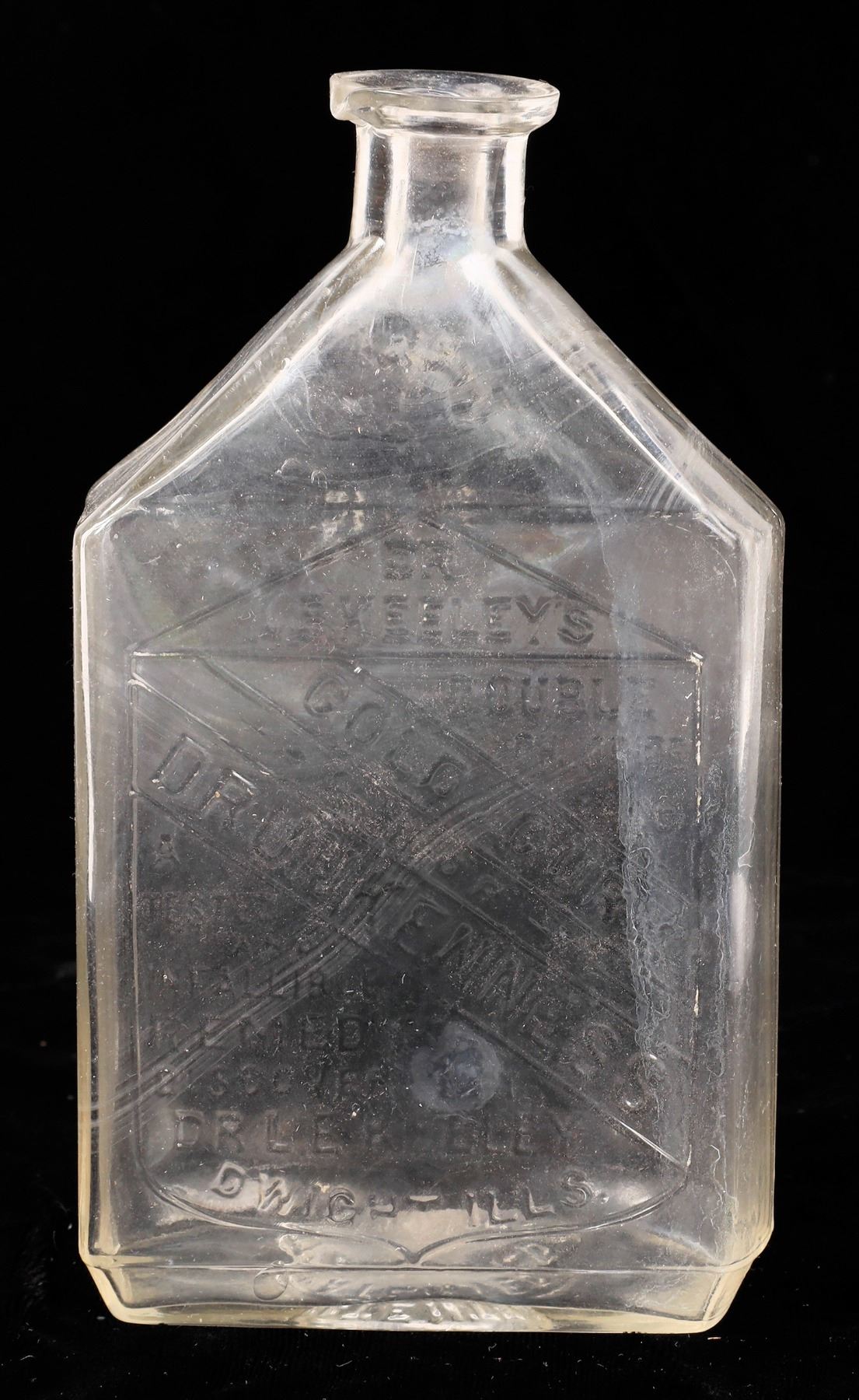 Very Rare clear embossed Double Chloride Of/Cold Cure/For/Drunkenness//Patented 1881. 5.5" with lip spout. No apparent chips or cracks. 1 small ding.