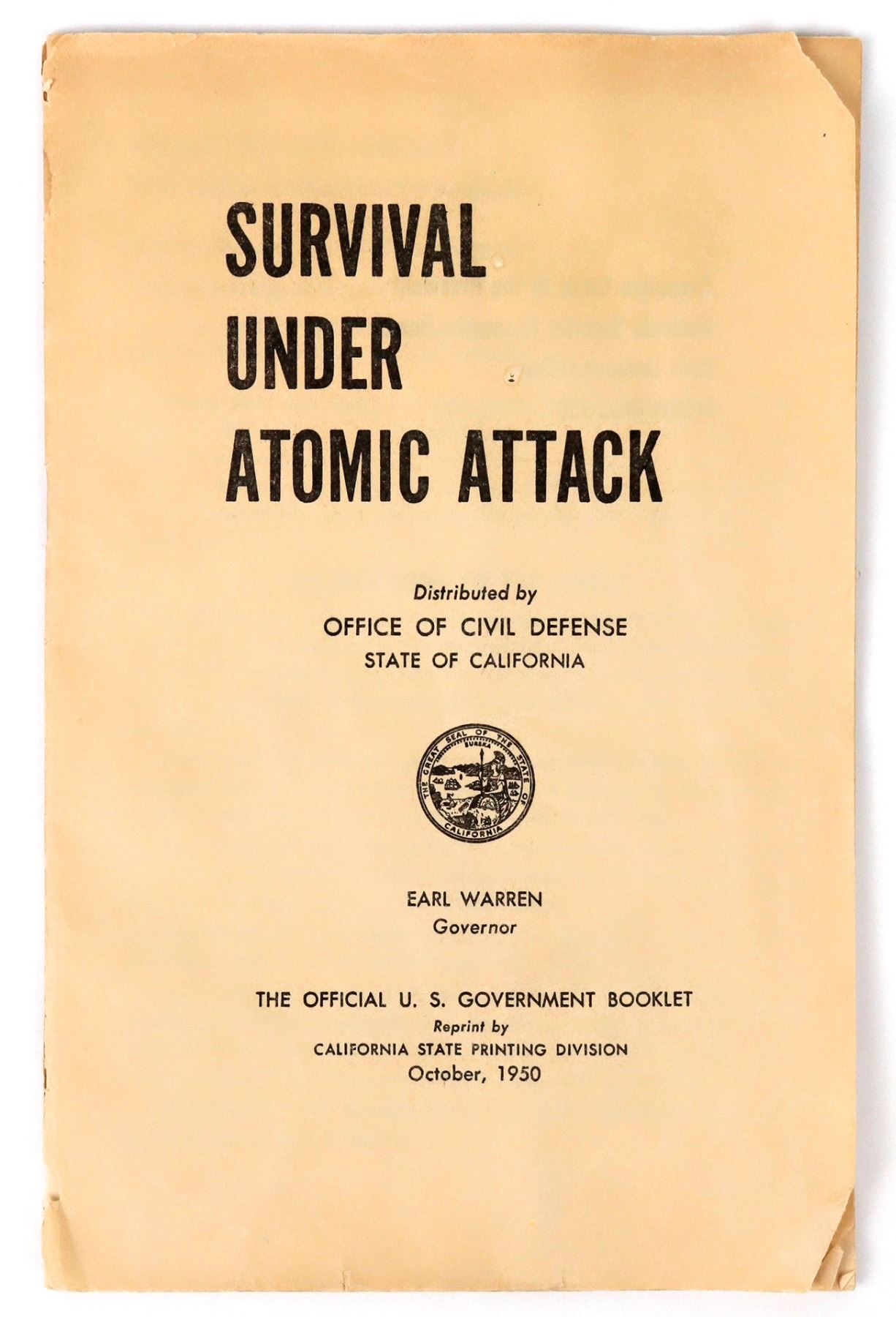 Nuclear attack survival guidebook printed in October 1950 by the Office of Civil Defense, as a protective measure during the Cold War. This booklet is in good condition, with minor toning. The first page has been cleanly cut out and remains with the rest of the booklet. Binding appears slightly worn. Slight crease in booklet. Booklet measures about 5"x7.8". See photo.