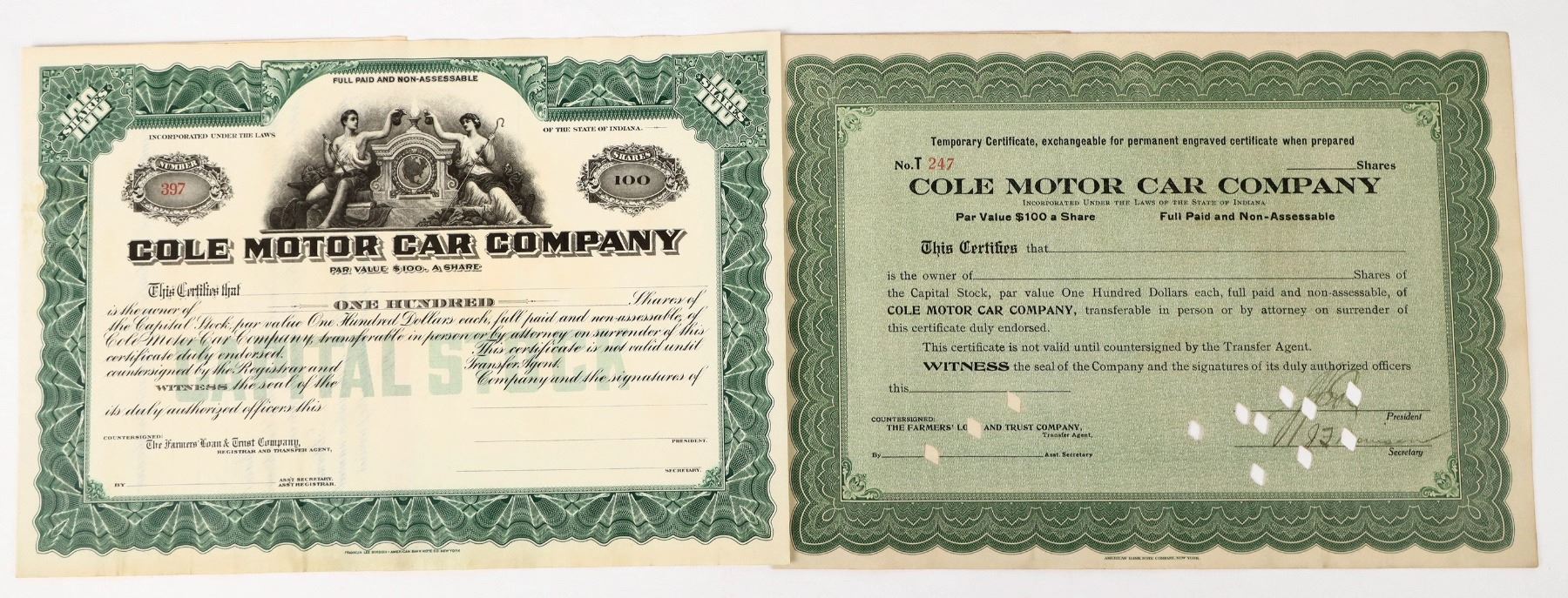 Lot of 2 different. One is unissued, the other is unissued but with cancelled corporate signatures. Built luxury cars in Indianapolis from 1908-1925.