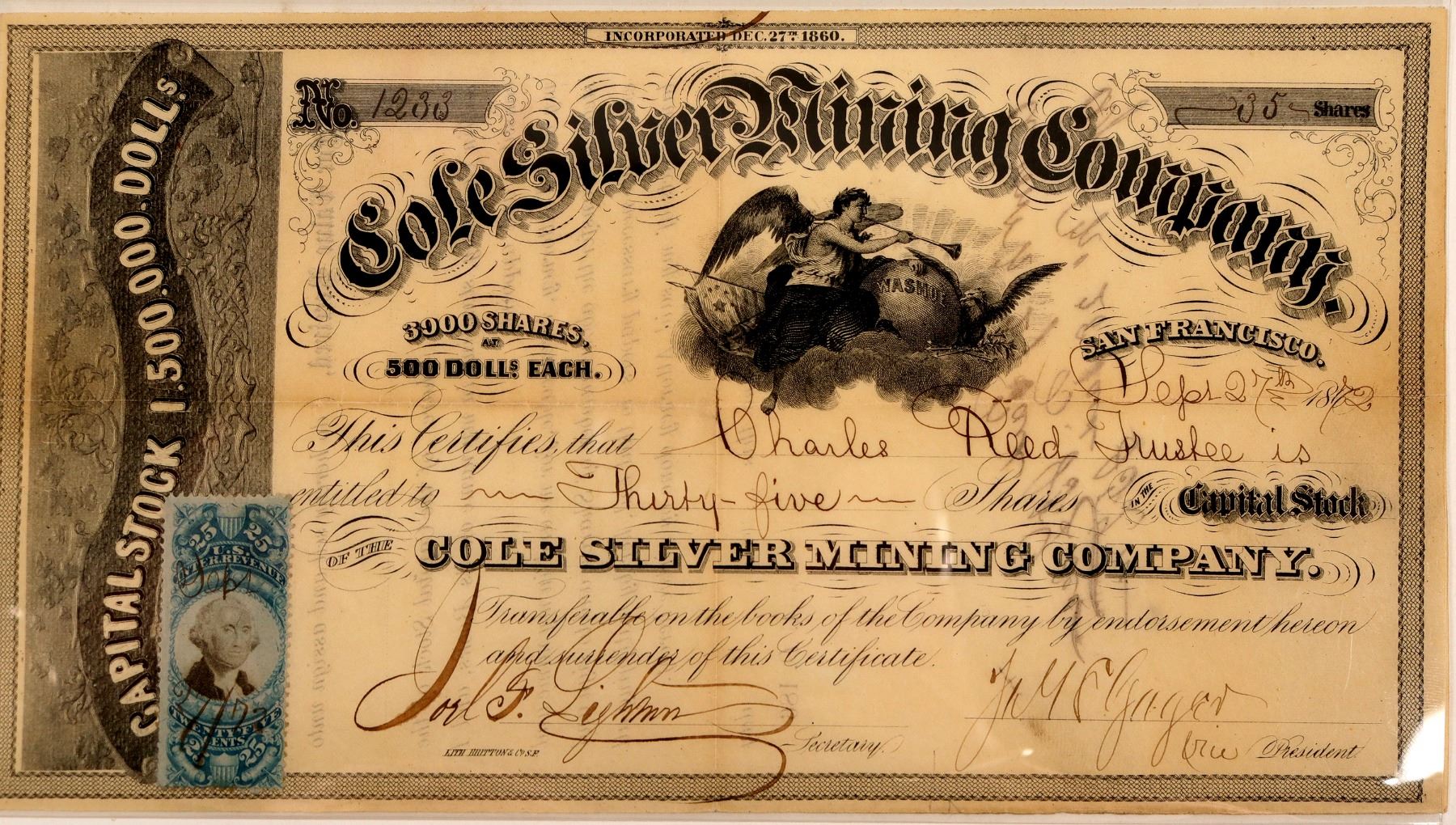 This is a rare 1860 Comstock incorporation - December 27th. However, it was not issued until September 27, 1872. # 1233 for 35 shares to Charles Reed trustee. Signed by secretary Lightman(?) and president J (?). 25c blue US Revenue stamp. Not cancelled. Allegorical vignette with the word 'WASHOE' written on it. Britton & Co. printer. One small corner fold. No real issues for this excellent cert. The Cole was most noted for striking the water source of the Virginia and Gold Hill water Company at a great depth in 1867. With water gushing into the mine at 1500 gallons per minute, the water company leased the water rights. So this is a mining Utah Territory incorporated company issuing stock well into statehood for a company that was making it smoney of water rights. Go figure!