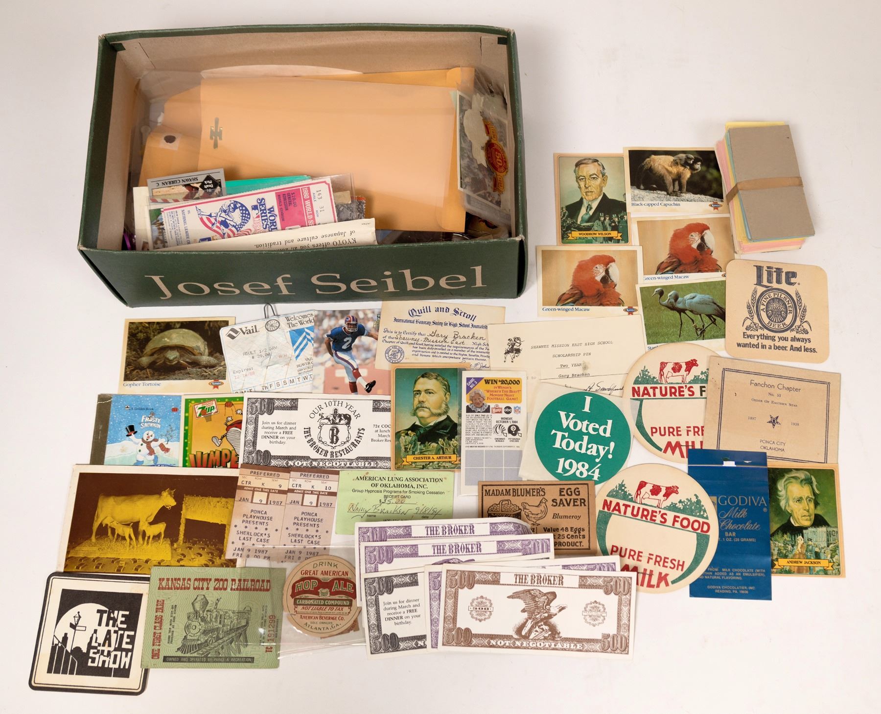 About 20 Oklahoma patches. 1.25" stack of old Monopoly money. About 20 World Series and sports tickets, paper coasters, misc. modern tokens, pin buttons, PBR and other bottle openers, TWA lighter, and more.