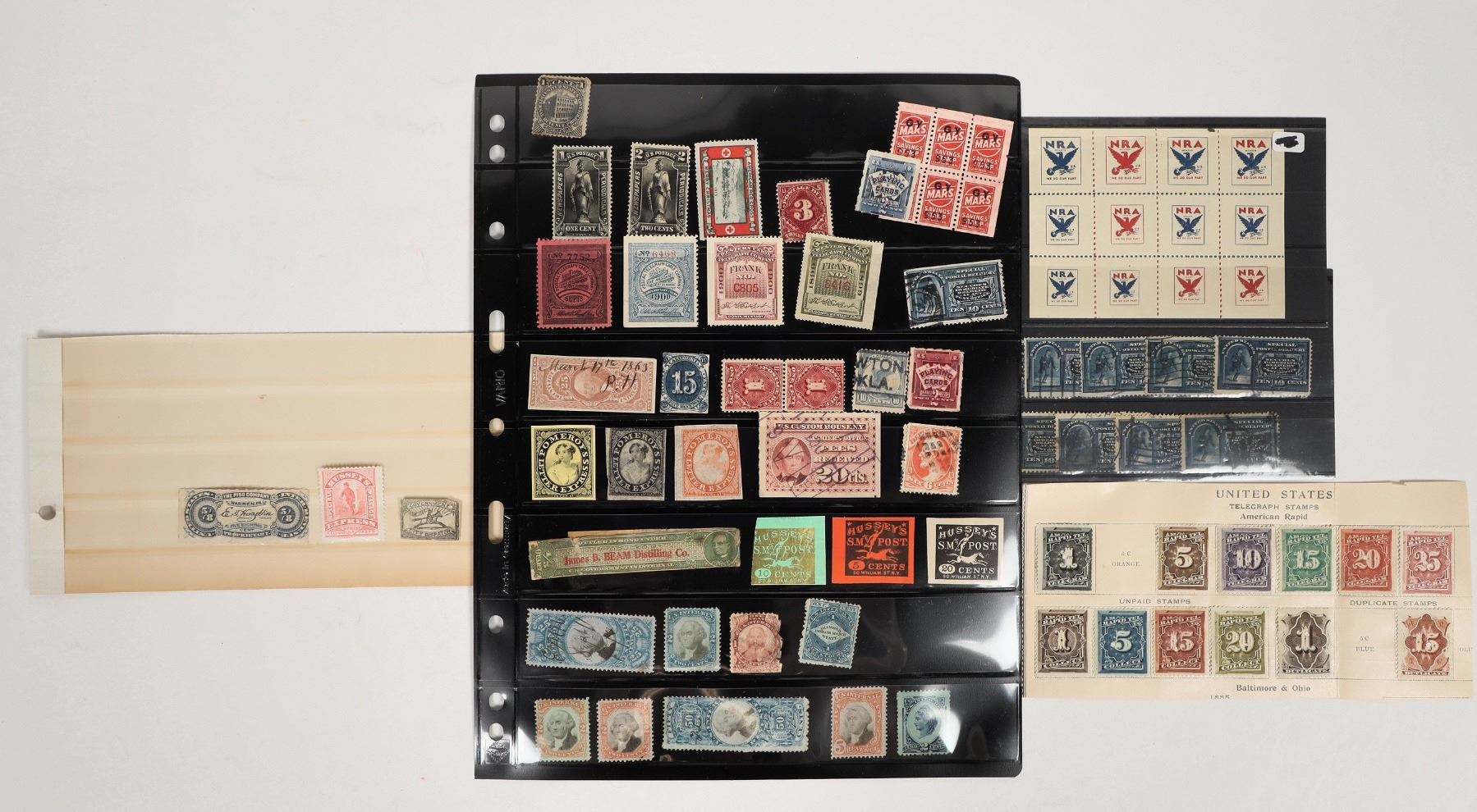 Lot of 3 Panels. 1. Panel of 12 Telegraph Stamps : 1-25 cent. Missing 3c and 8c. 2, Panel w/12 NRA and 9 Special Delivery. 3. Sheet w/ various :Pomeroy's letter express, Hussey's S.M. Post , MARS, savings stamps, Western Union Telegraph, U.S. Customs House 20c, Revenue stamps.
