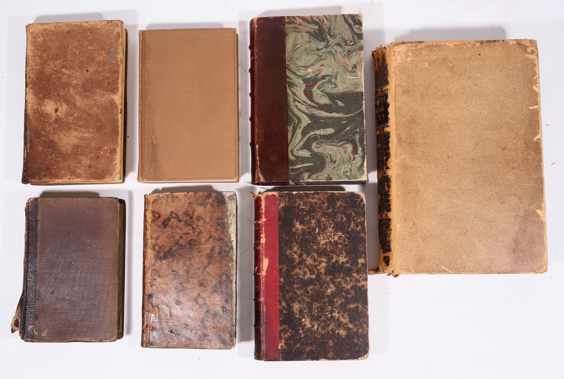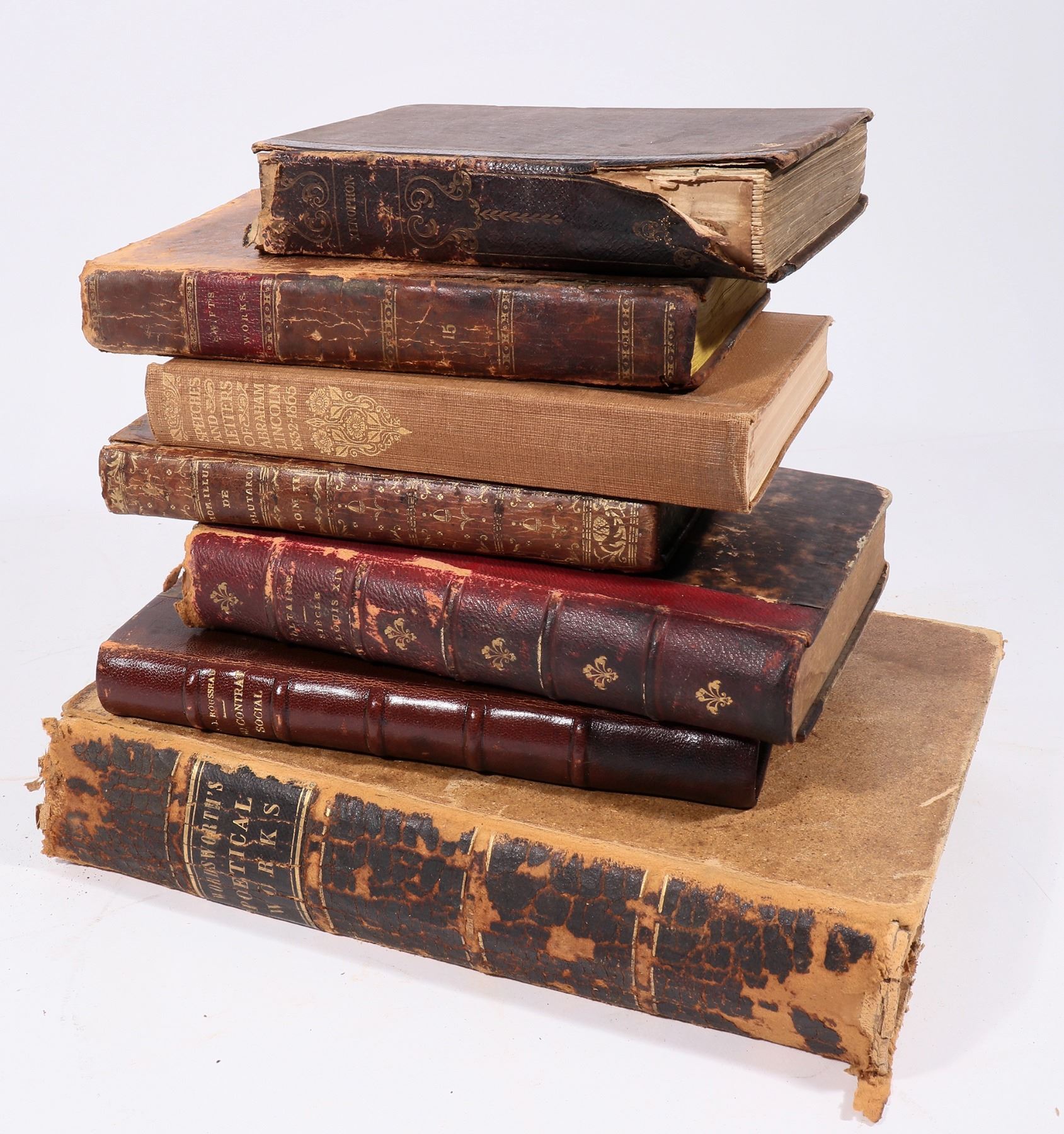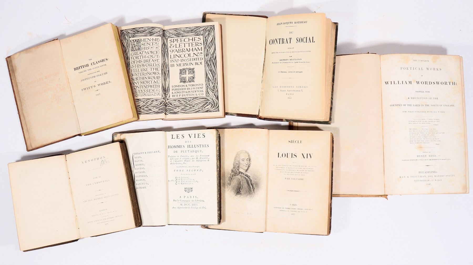 7 old assorted books. Wordsworth's Political Works, 1848 551pp, foxing, board issues etc. Xenophon Vol. 2 by Cooper, 1830 351pp, spine and stain issues. Les Vied des Hommes Illustres, second edition, 343pp, board issues. Siecle de Louis XIV by Voltaire, 1872606pp, some foxing. Du Contrat Social by Rousseau, 1931, 344pp. Everyman's Library by Ernest Rhys, 1929, 2136pp. The British Classics, Volume The Forty-Ninth of Swift's Works, 1813, 308pp, foxing. Please inspect all volumes.