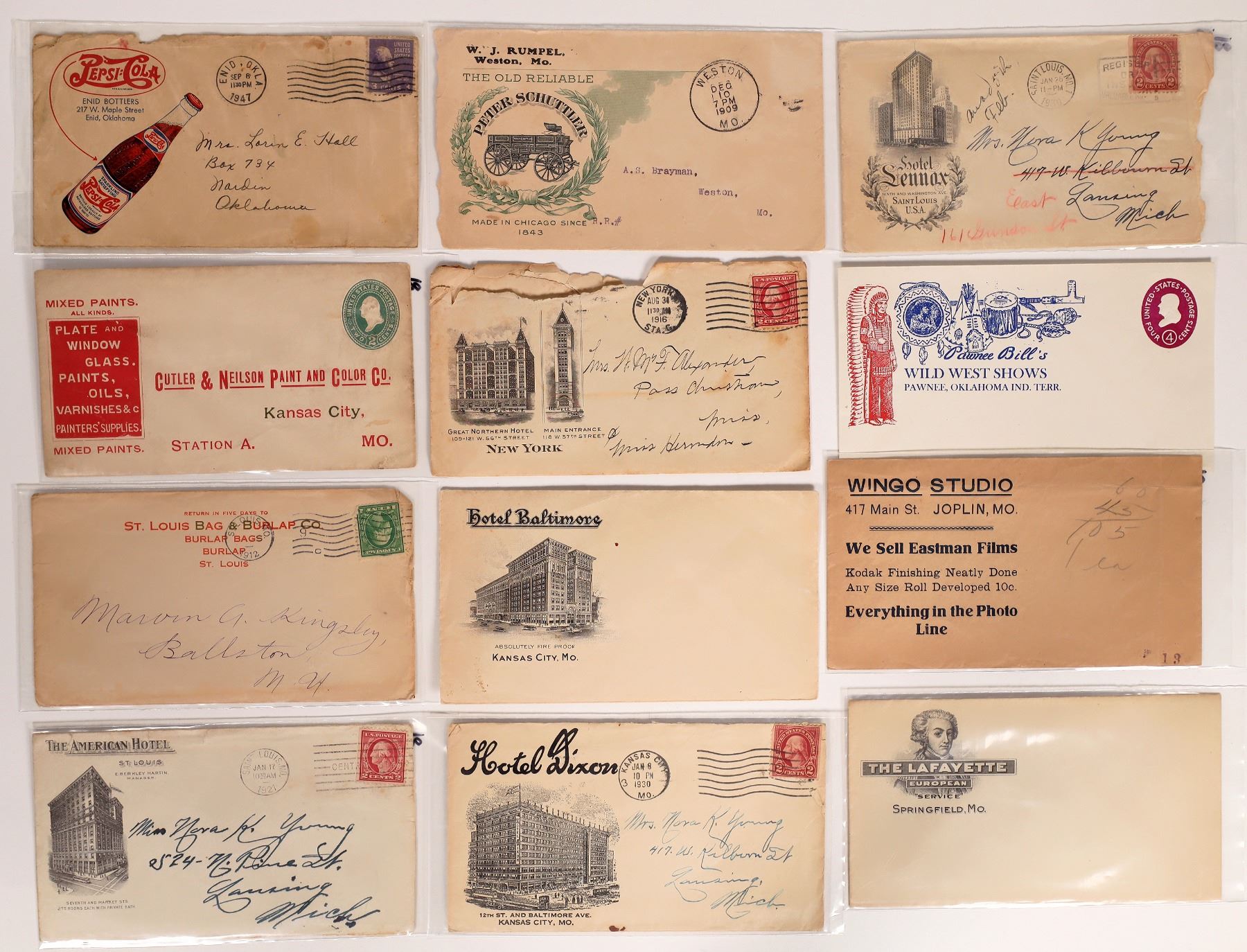 Lot of 12. Fabulous Rumpel ëThe Old Reliable' wagon, 1909; Pawnee Bill's Wild West Show with Native American pictorial; Color Pepsi Cola Enid Okla; Red Cutler & Nelson paints Kansas City; Red St. Louis Bag & Burlap 1912; New York Great Northern Hotel 1919 with contents with talk about a railroad strike; Hotel Baltimore Kansas City; Hotel Dixon Kansas City; American Hotel St. Louis; Hotel Lennox St. Louis; The Lafayette Springfield Missouri; Wingo Studio Joplin.