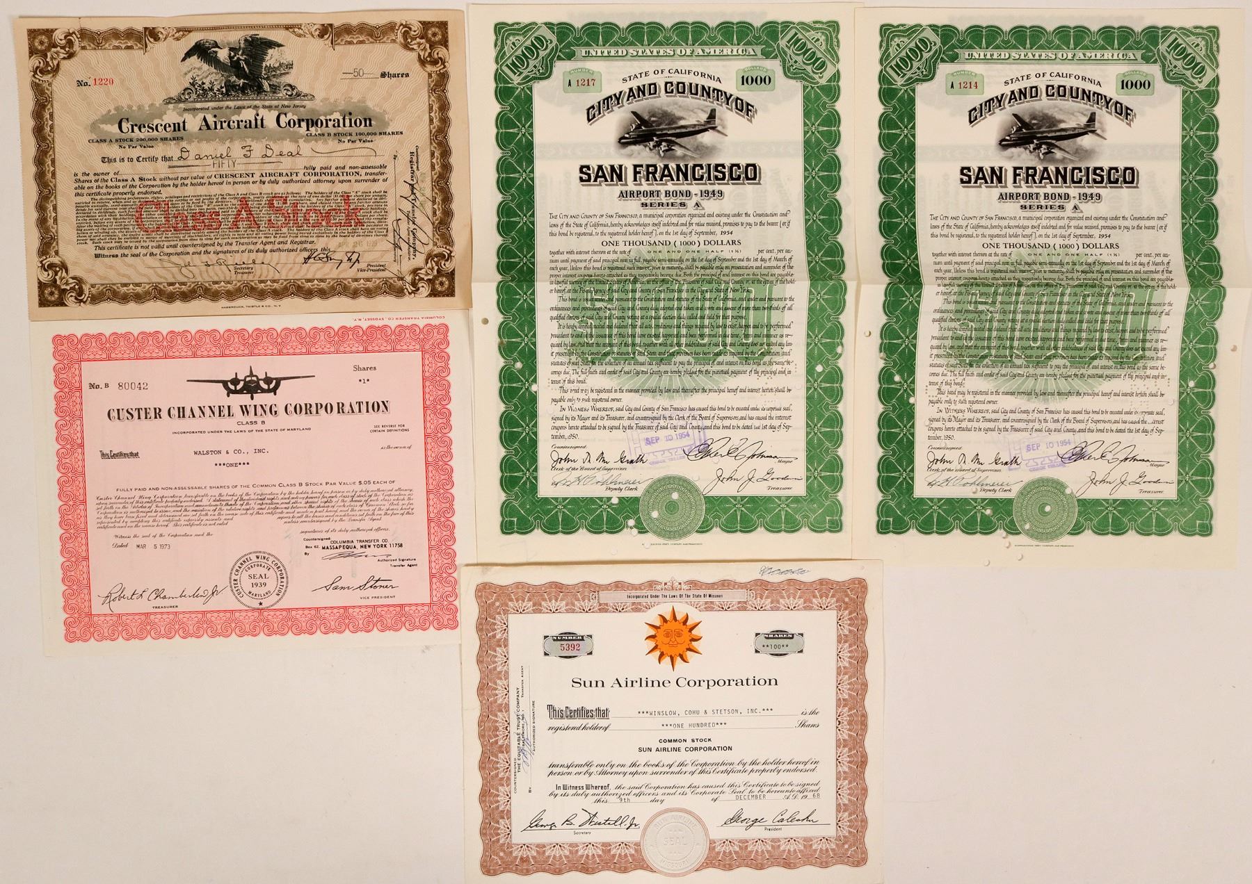 5 certificate Two from the county and city of San Francisco, $1000, stamped paid, issued in 1954. Sun Airline Corp. Brown, issued Dec 1968. Custer Channel Wing Corp. incorp 1939 Maryland, Red, issued March 1973. Crescent Aircraft Corp. Incorp New Jersey, Brown, no par value, issued April 1929. All are EF condition.