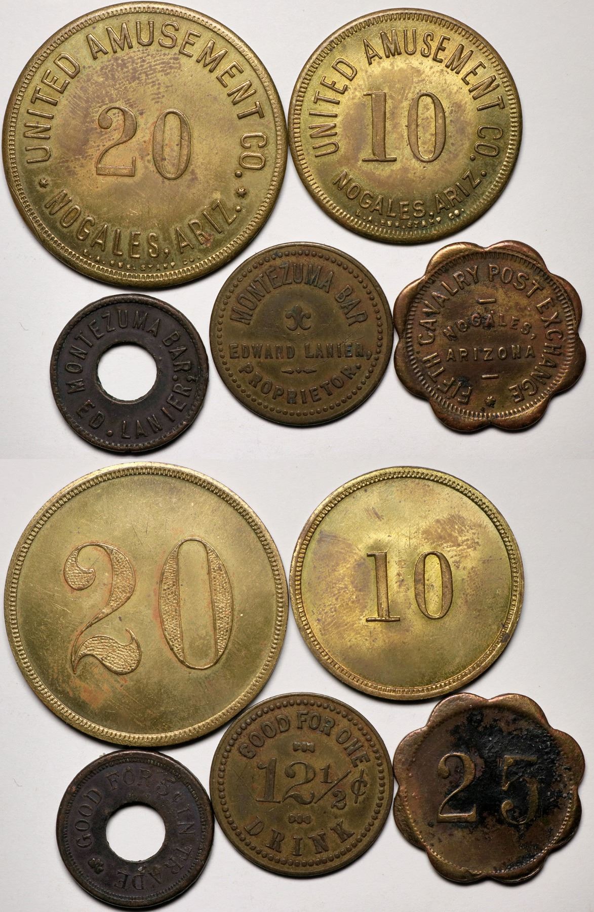 Lot of 5. 1) United Amusement Company/ 20 / Nogales, Ariz. // 20. Brass. 35mm. 2) United Amusement Company/ 10 / Nogales, Ariz. // 10. Brass. 30mm. 3) Fifth Calvary Post Exchange / Nogales / Arizona // 25. Scallop, Brass, 25mm. 4) Montezuma Bar/Ed. Lanier // GF 5c IT. Brass. 20mm. Hole. 5) Montezuma Bar/Edward Lanier/Proprietor. // Good For One / 12.5c / Drink. Brass. 25mm.