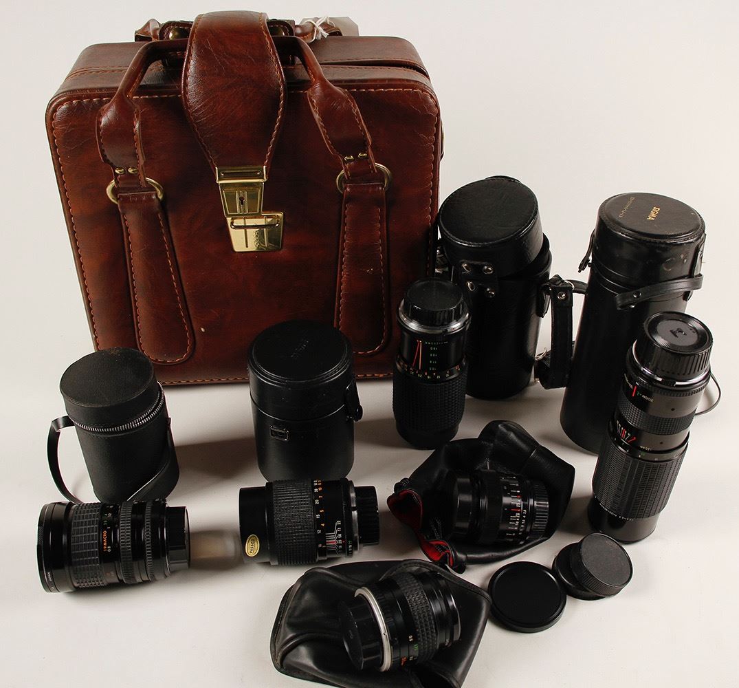 This is a group of six 35mm lenses. Included in the collection is a Sigma 120 mm to 300mm zoom, a Sigma 28 mm to 85mm zoom, a DeJur 135mm, a Minolta 50 mm lens, Beck 35mm lens and a Osawa 80mm to 200mm lens, All come in a heavy duty leather case. They are for older camera mounts, but adapters are available. HWAC# 56646 Date: Location: