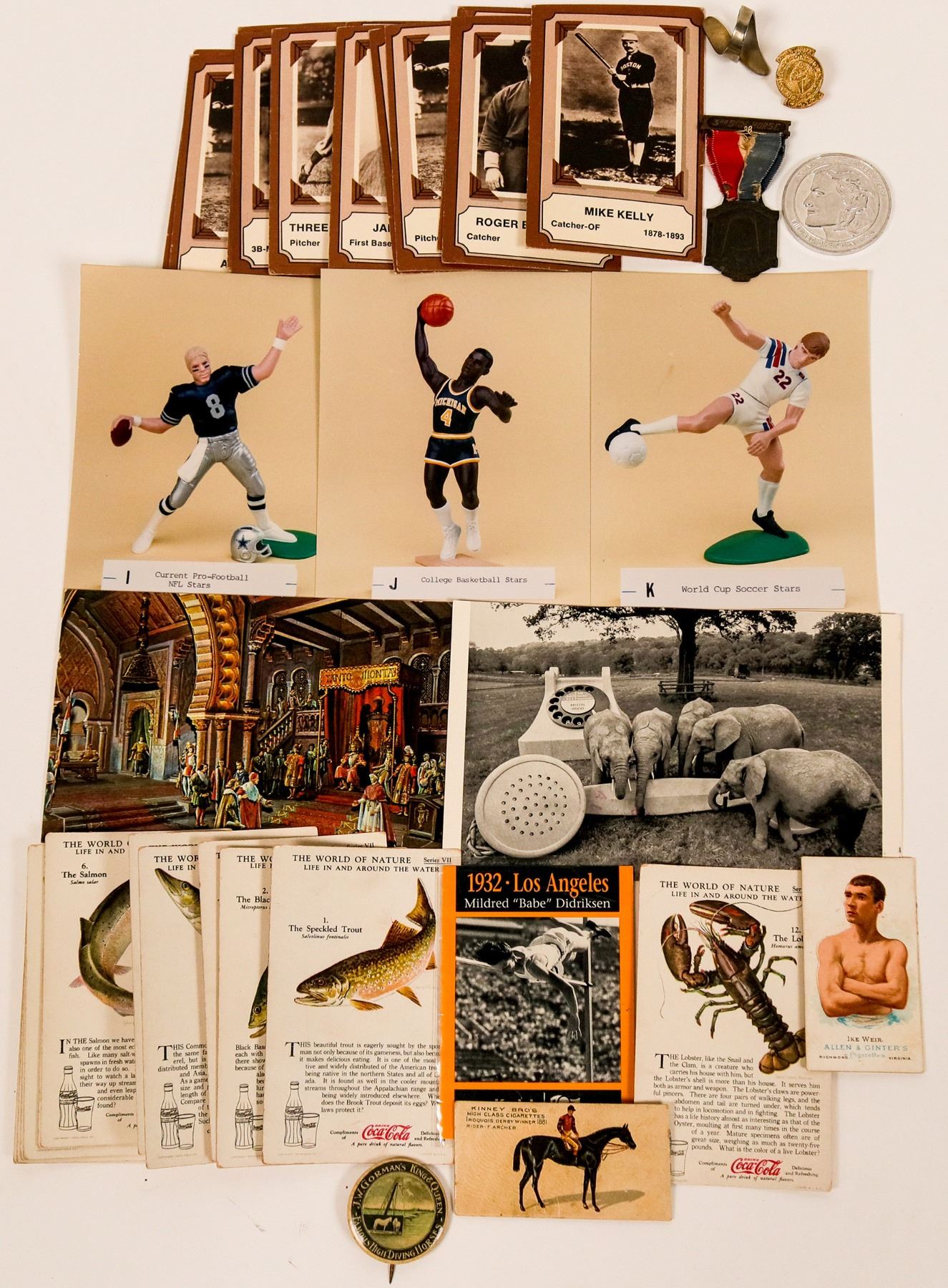 Varied collection of 26 sports and animal show/event memorabilia, from the U.S., c1880s-1967. Includes: two cigarette cards from the 1880s, Allen & Ginter, with litho of boxer, Ike Weir, and Kinney Bro's., with litho of Iroquois Derby Winner 1881; pinback of J.W. Gorman's high diving horses, early 1900s; opening of Balboa Stadium, San Diego, 1915 badge, with ribbon intact; group of 13 Pioneers of Baseball 1974 R.G. Laughlin trading cards; Montreal Expo 1967 ring; Special Olympics Winners Circle badge, 2010-2011, and more.