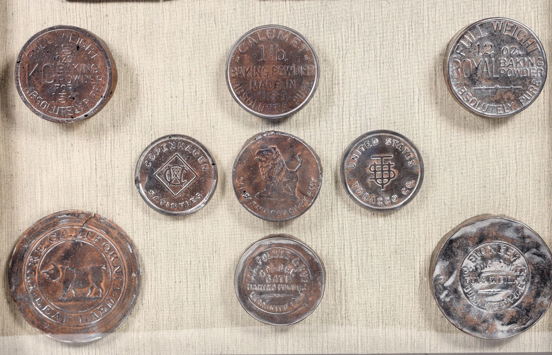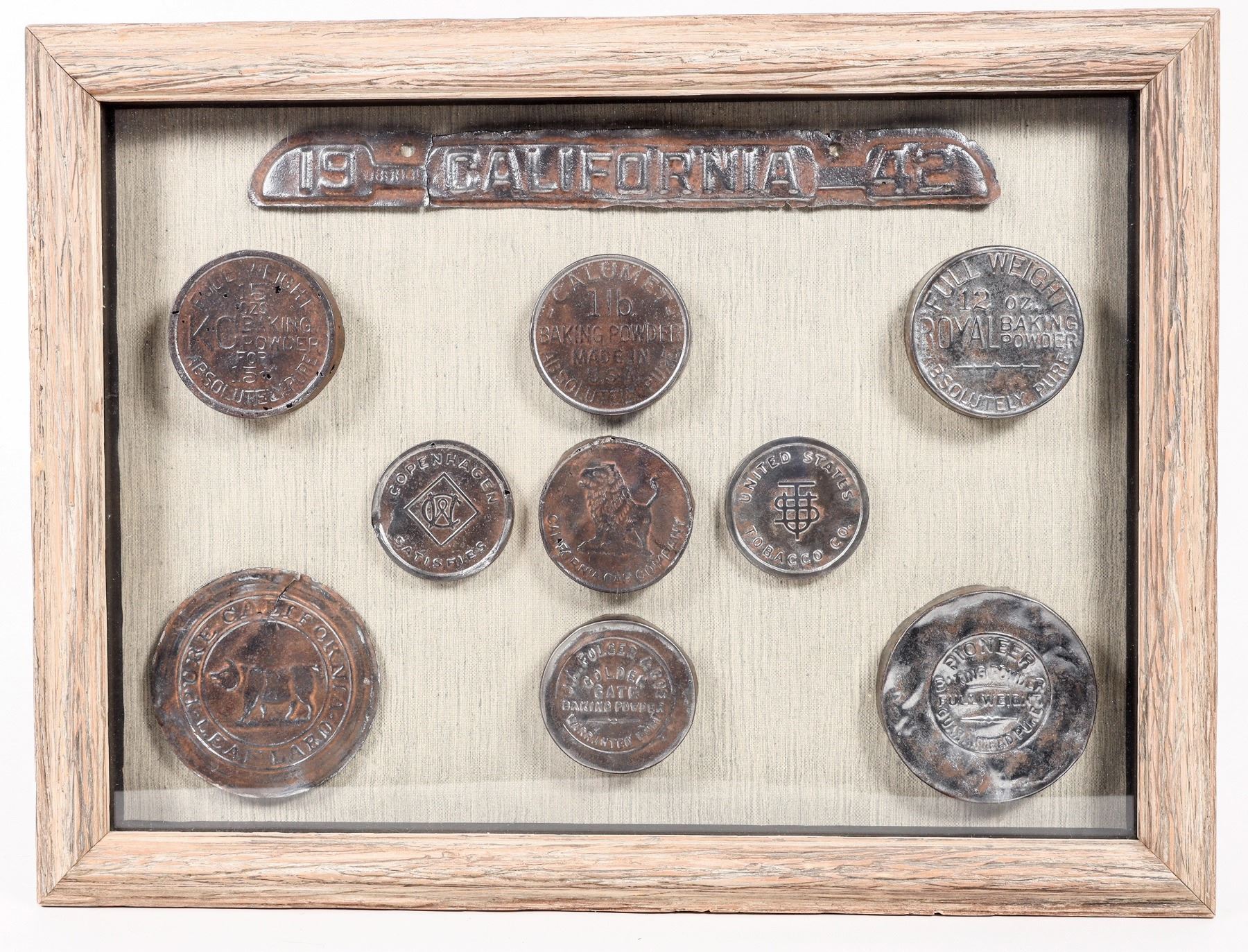 Lot of 10. Mounted in glass encased window box. California license plate metal tag "California 1942". Nine tin lids to baking powder cans I.E; Royal Baking Powder, Calumet Baking Powder, Golden Gate Baking Powder and six others.....