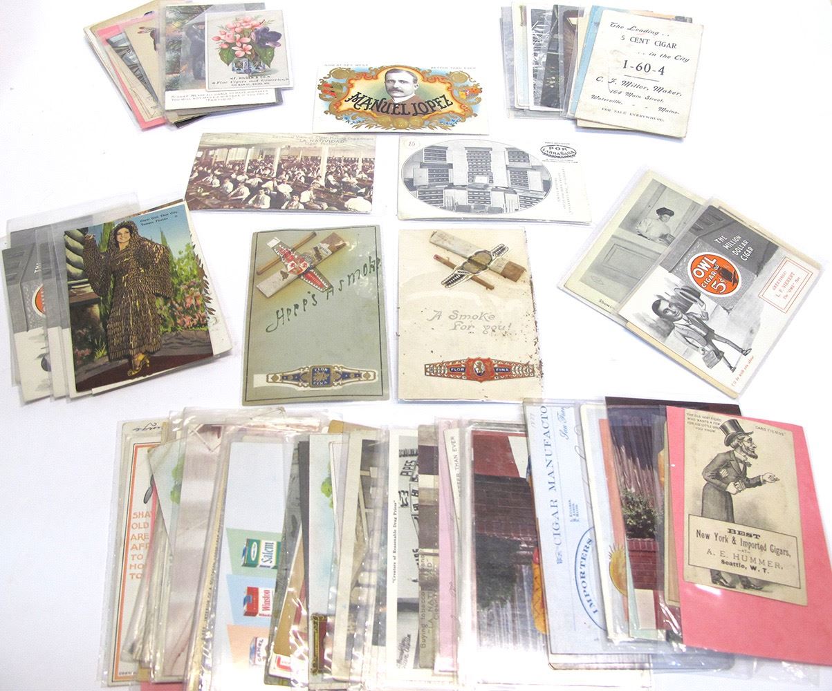 Approx 80 items, many are cigar related and mostly postcards. Several cigar store Indian postcards and cigar store interiors. Includes 2 3D Flor Fina postcards with mini cigarettes, a match and label. Brands include Manuel Lopez, Por Larranaga, La Natividad, Daniel Webster. Locations include Key West, Tampa, Carolina's and more. Date: Location: HWAC # 54639