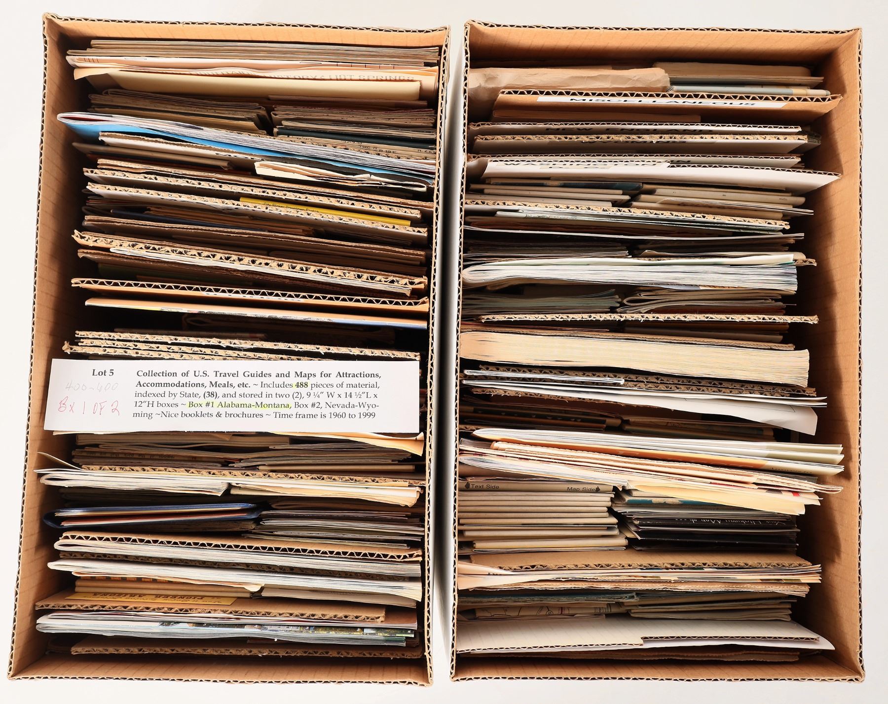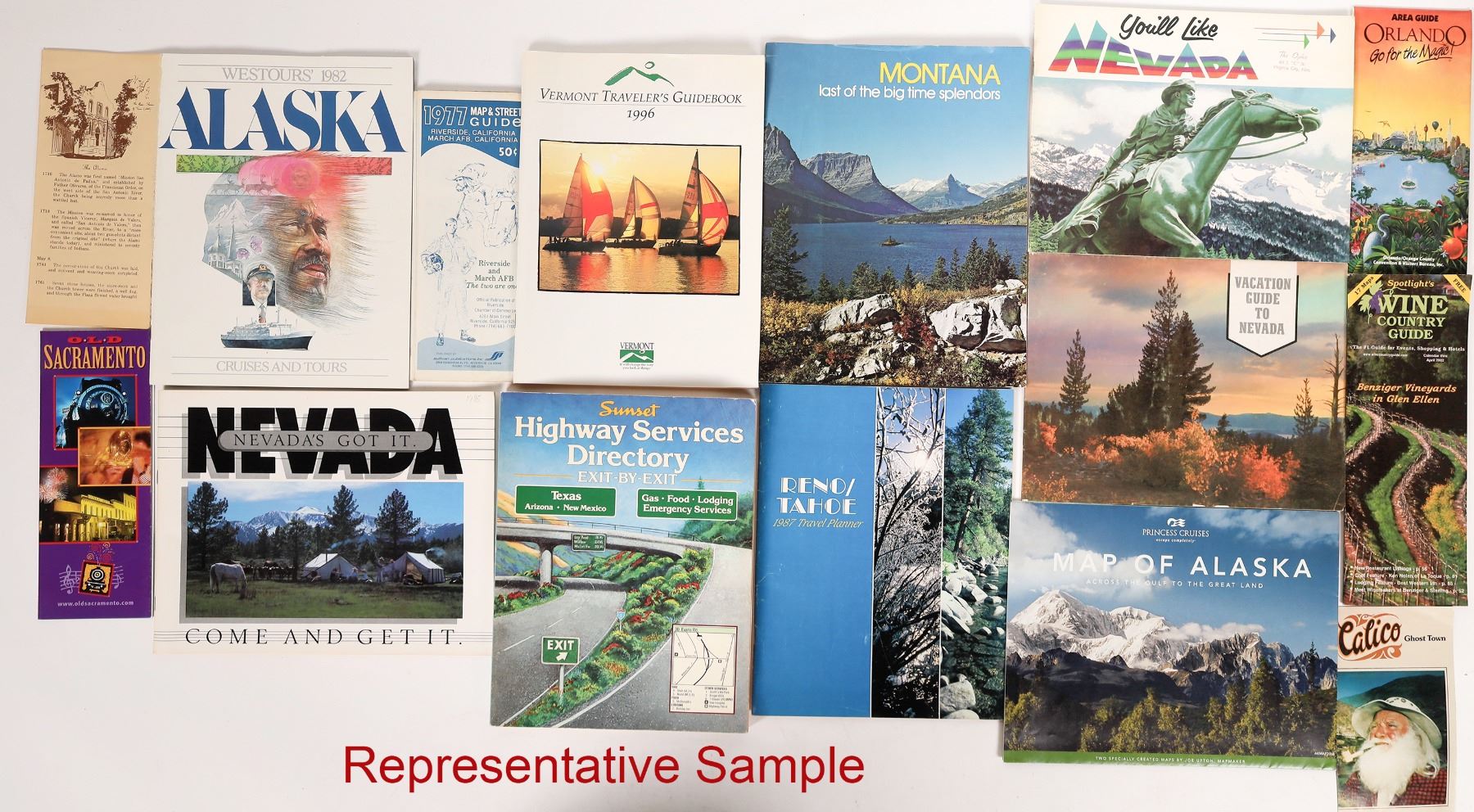 Large collection (2 file boxes!) of Travel Guides and Maps for Attractions, Accommodations, Meals, etc.~ Includes 488 pieces of material, indexed by State, (38), and stored me(2), 9¼" W x 14 ½" L x 12"H boxes~ Box #1 Alabama-Montana, Box #2, Nevada-Wyo ming ~Nice booklets & brochures~ Circa 1960-1999